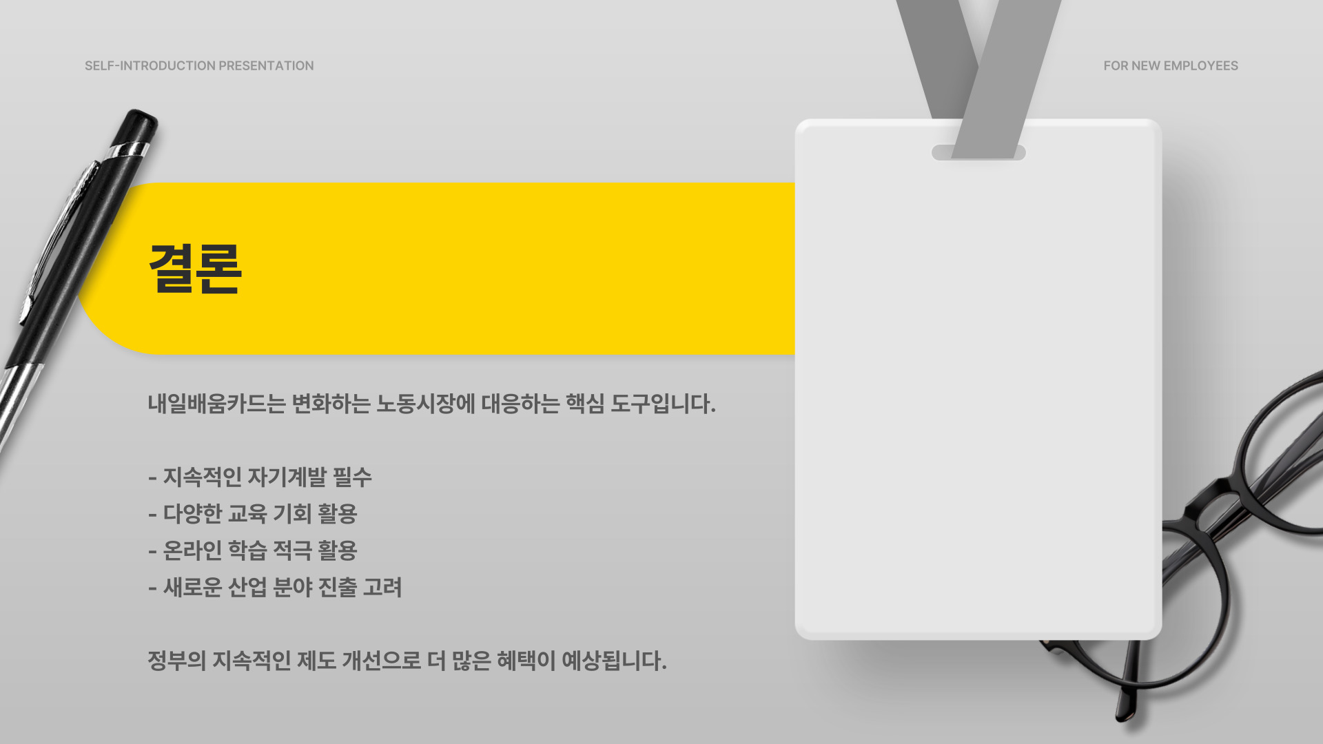 고용노동부 내일배움카드는 개인의 직업 교육과 역량 강화를 위한 훌륭한 도구입니다. 교육비 지원을 통해 경제적 부담을 덜고, 원하는 직업 기술을 습득할 수 있는 기회를 제공합니다. 내일배움카드를 활용하여 자신의 경력을 발전시키고, 새로운 직업 세계로 나아가는 발판으로 삼길 바랍니다.