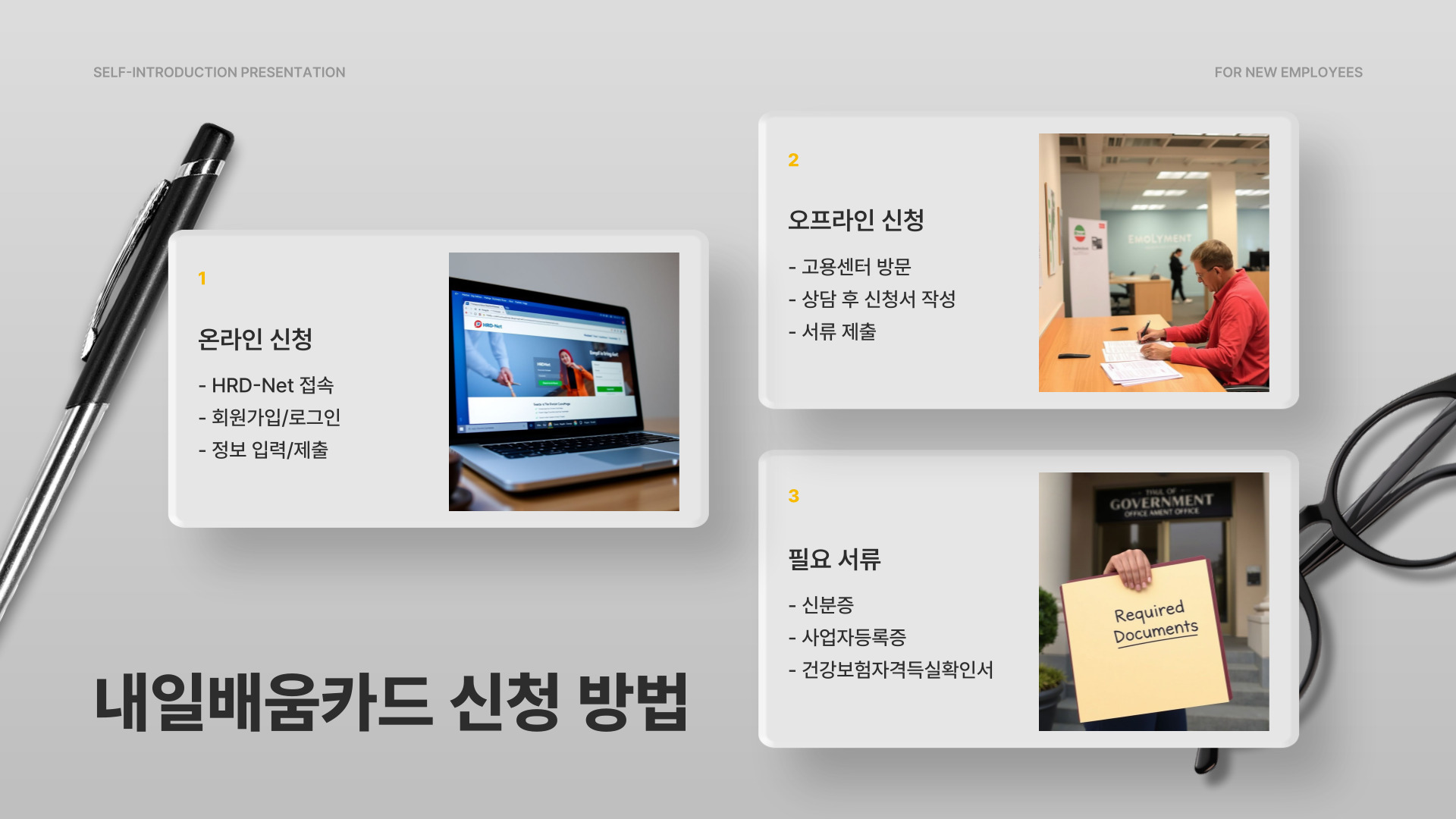 내일배움카드를 신청하기 위해서는 먼저 고용노동부의 관련 홈페이지를 방문하거나 가까운 고용센터를 찾아야 합니다. 신분증과 함께 필요한 서류를 제출하면, 담당자가 신청 절차를 안내해 줄 것입니다. 여기서 주의해야 할 점은 서류 준비가 철저해야 하며, 본인의 직업훈련 필요성을 미리 잘 정리해 두는 것이 좋습니다.