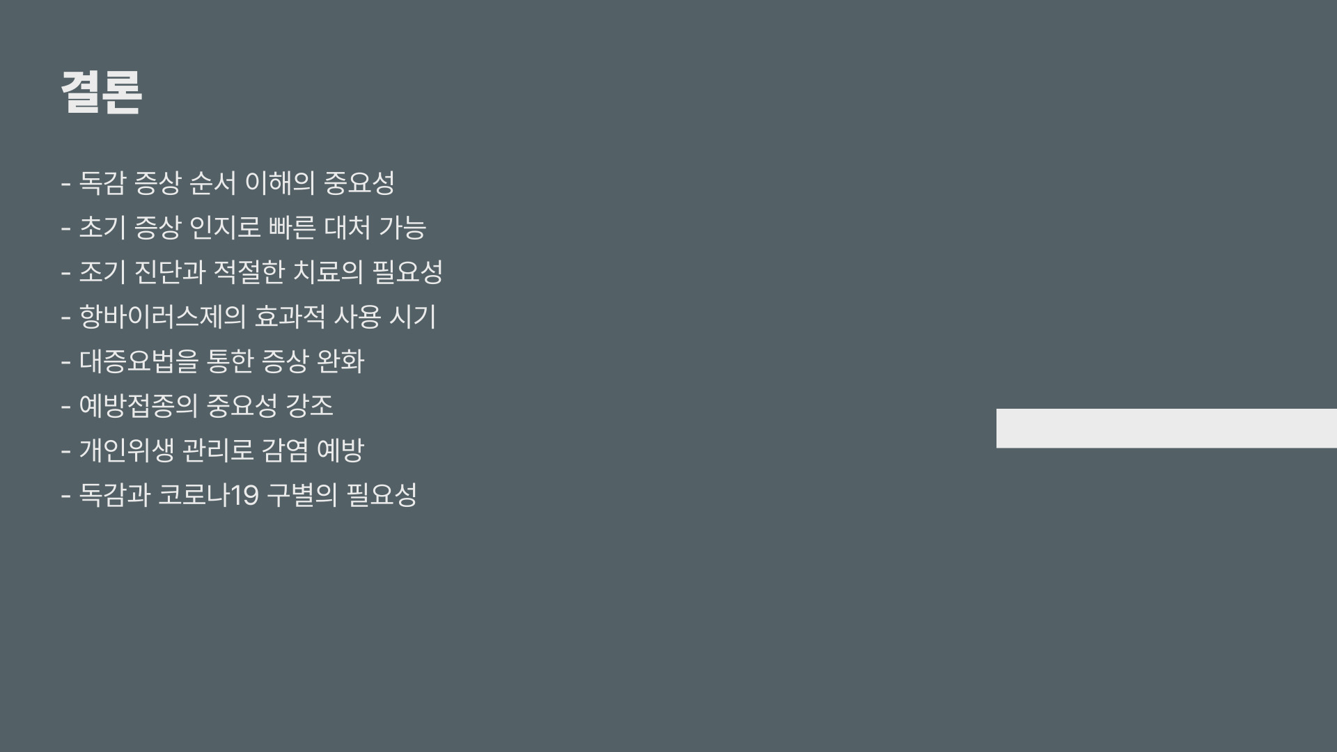 - 후반 증상: 회복을 위한 영양 섭취 및 휴식