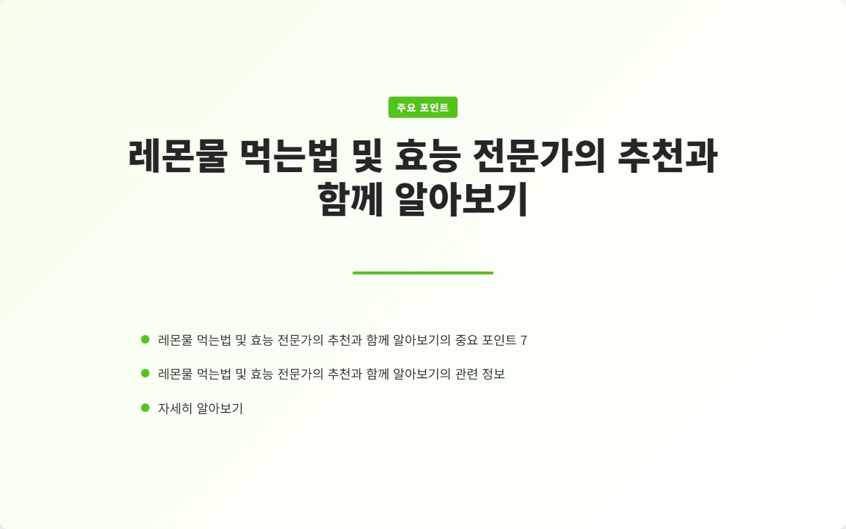 레몬물의 올바른 섭취 방법과 효능을 종합적으로 정리하면 다음과 같습니다. - **레몬즙을 물에 희석해 매일 섭취** - **비타민 C와 소화 촉진 효과를 기대** - **식사 후에 마셔 위장 자극을 피하기** 이제 레몬물을 통해 건강과 다이어트를 성공적으로 이뤄보세요! 궁금한 점이 있거나 경험담이 있으시면 댓글로 남겨주세요.