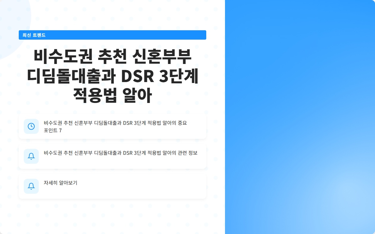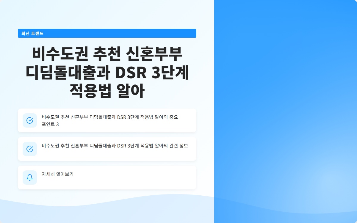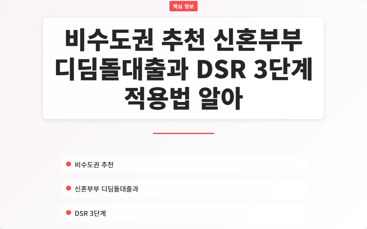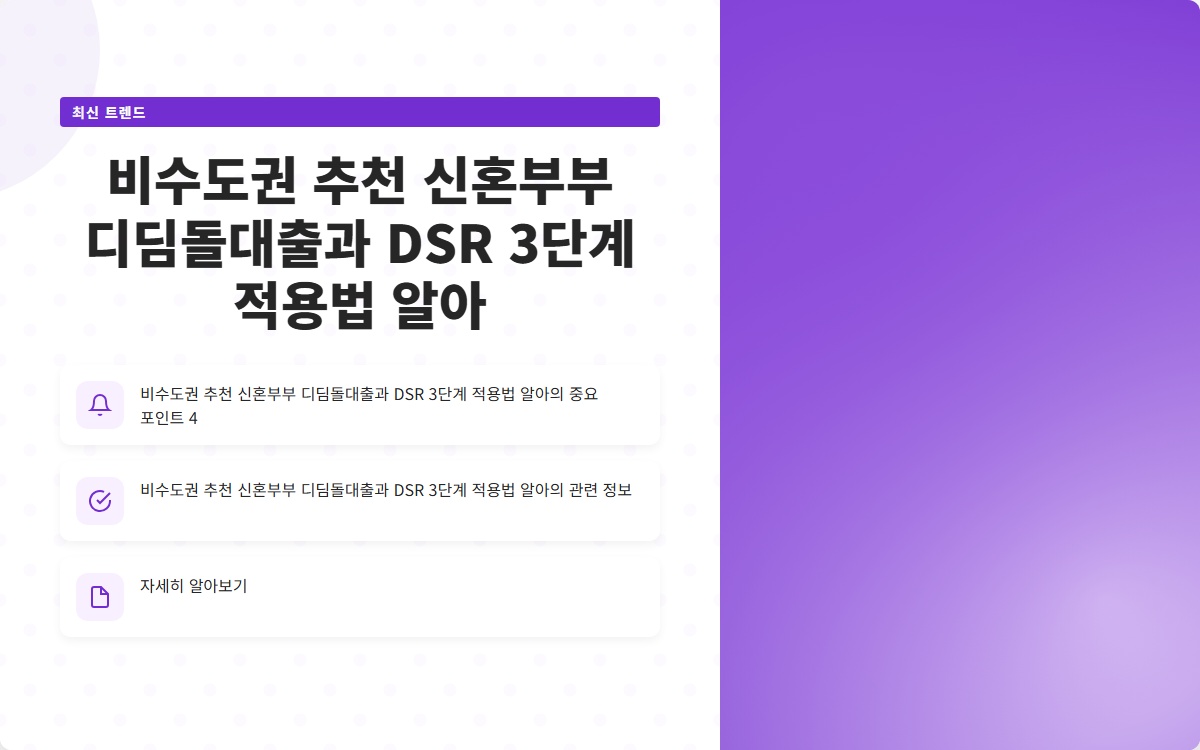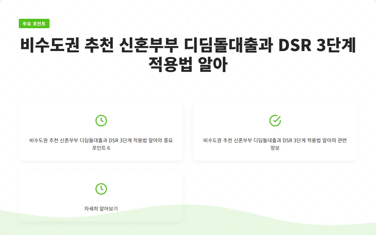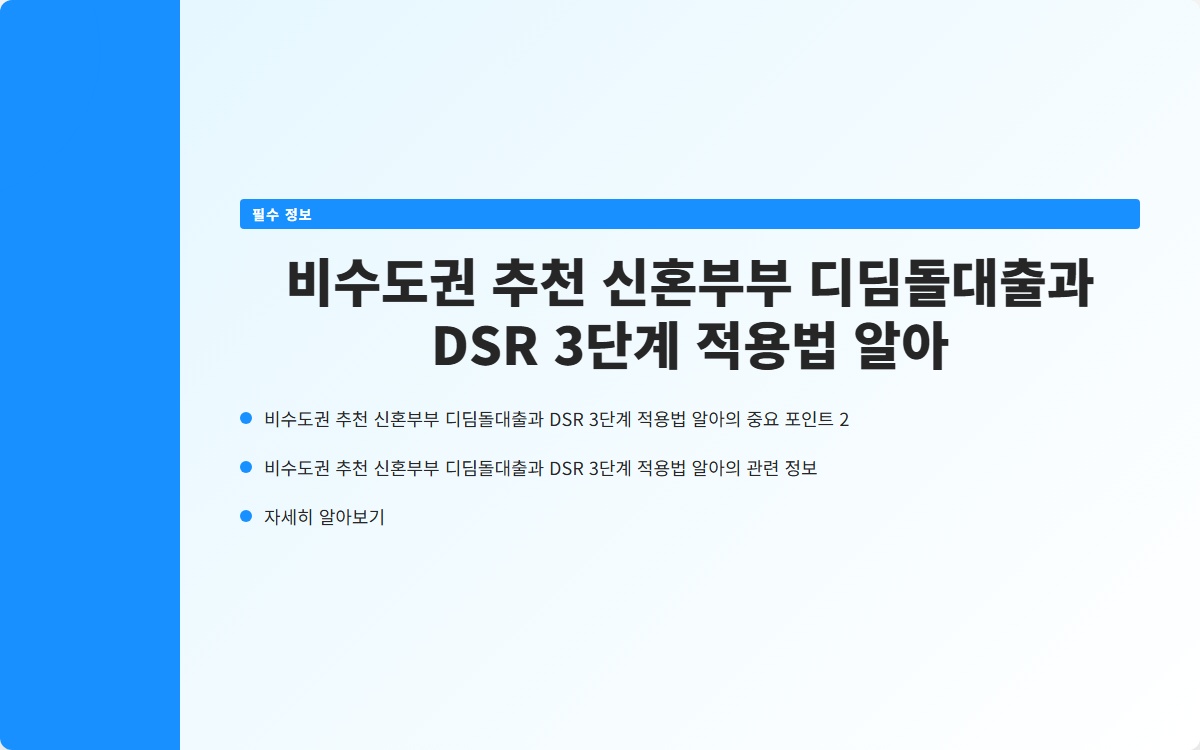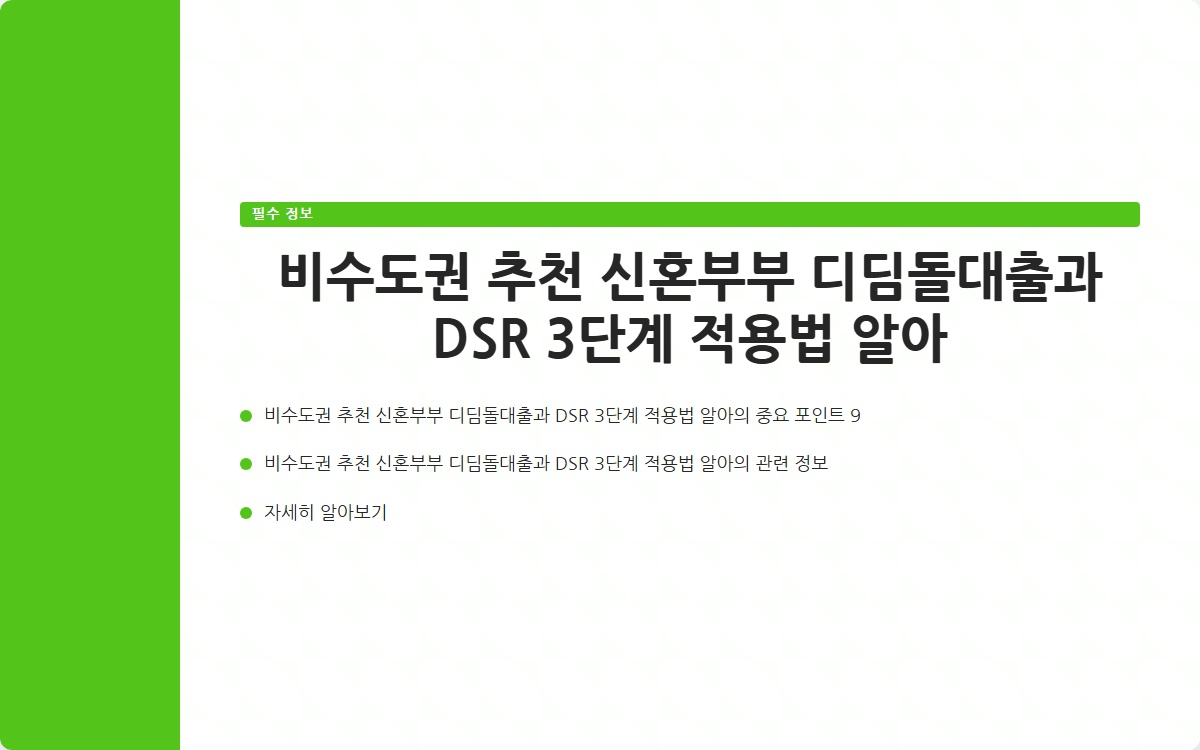 신혼부부의 주택 구입은 큰 결정입니다. 특히, 비수도권에서의 주택 구매를 고려하는 신혼부부에게 디딤돌대출은 매우 유용한 금융 상품입니다. 이번 포스트에서는 신혼부부 디딤돌대출의 특징과 함께 DSR(총부채원리금상환비율) 3단계 적용법에 대해 알아보겠습니다.