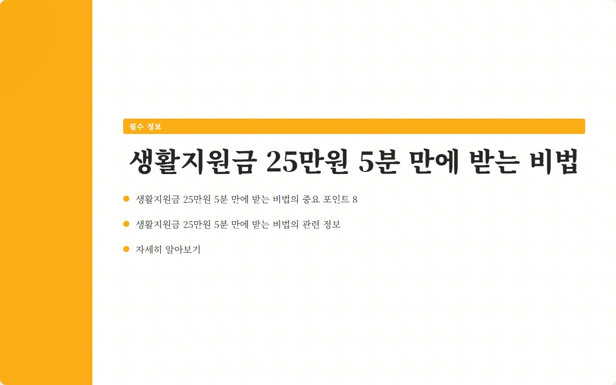 혹시 생활지원금 25만원을 놓칠까 두려운가요? 많은 사람들이 이 지원금을 받을 수 있다는 사실을 모르고 있습니다. 오늘은 이 지원금에 대한 중요한 정보와 꿀팁을 알려드리겠습니다. 지금 확인해보세요!