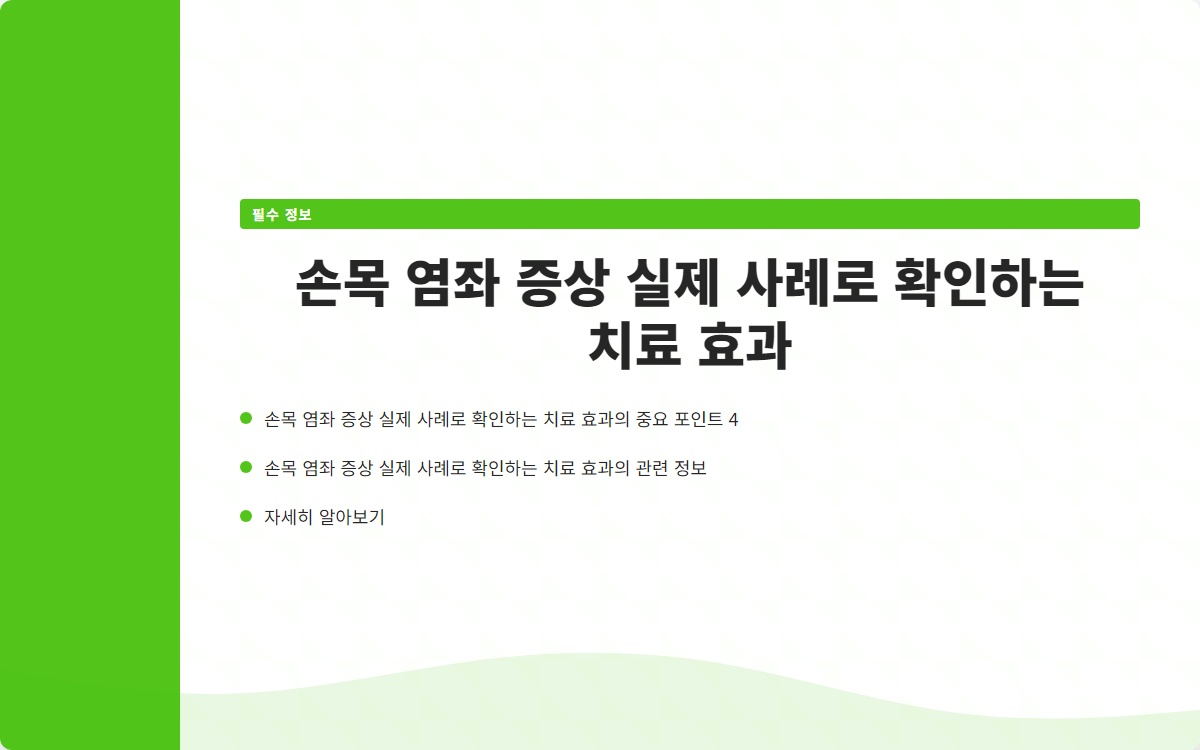 통증이 완화된 후에는 스트레칭과 강화 운동을 통해 손목의 기능을 회복해야 합니다. 전문가의 도움을 받아 안전하게 운동을 진행하는 것이 좋습니다. 이제 손목 염좌에 대한 실제 사례를 통해 치료 효과를 확인해보겠습니다.