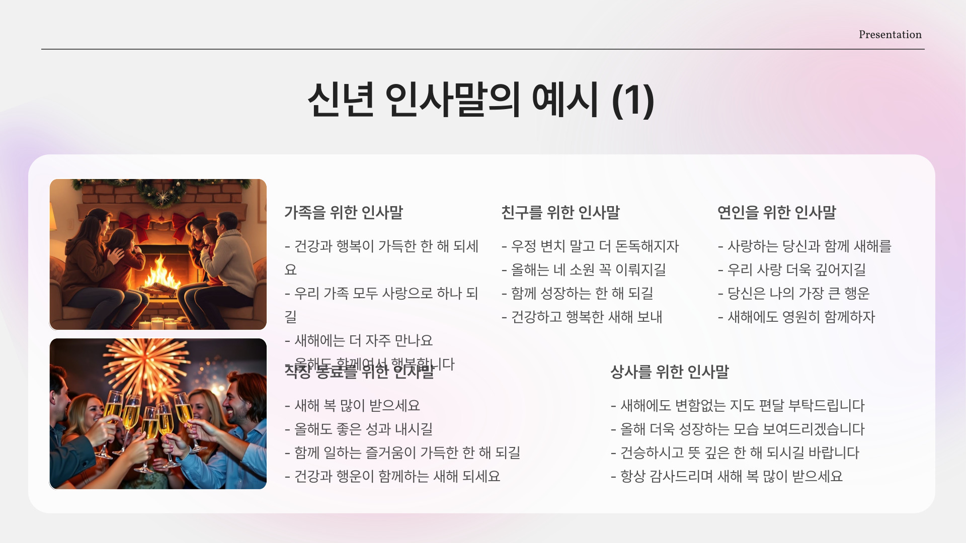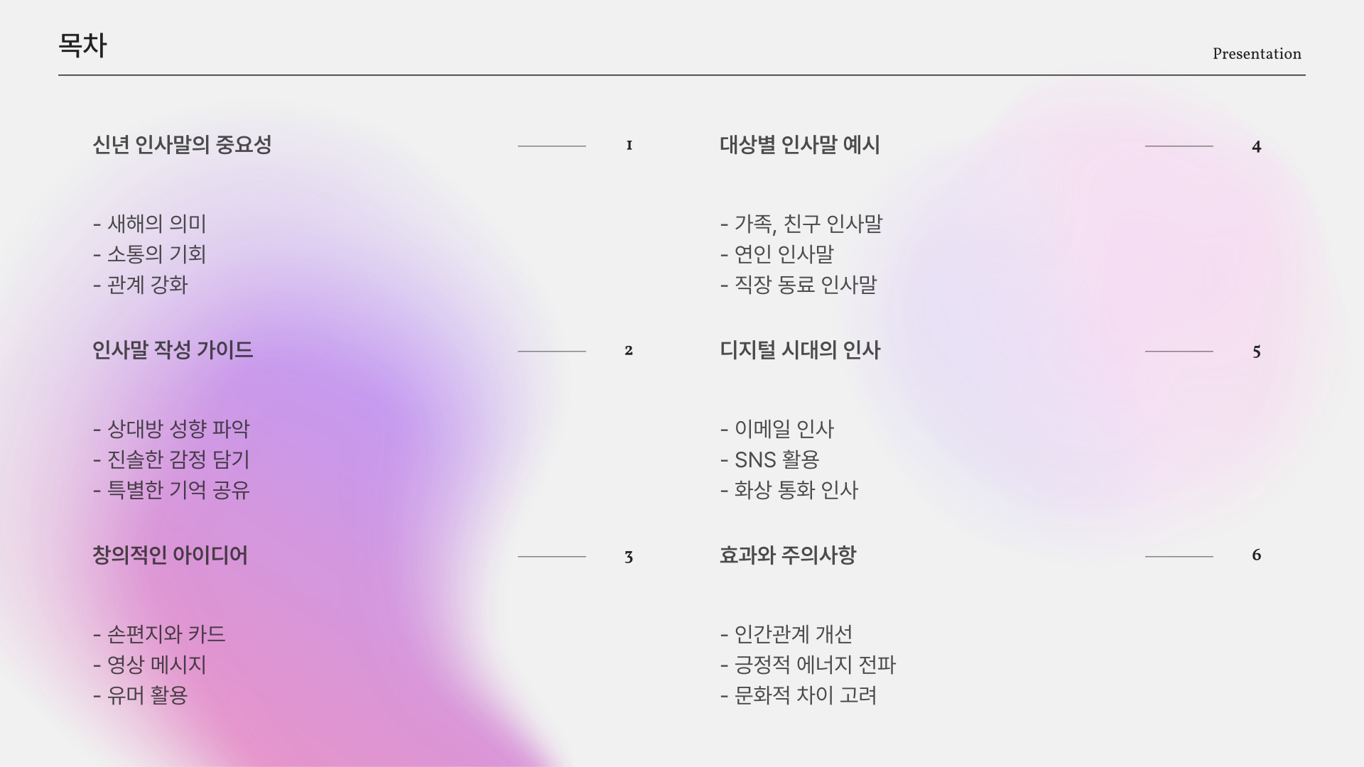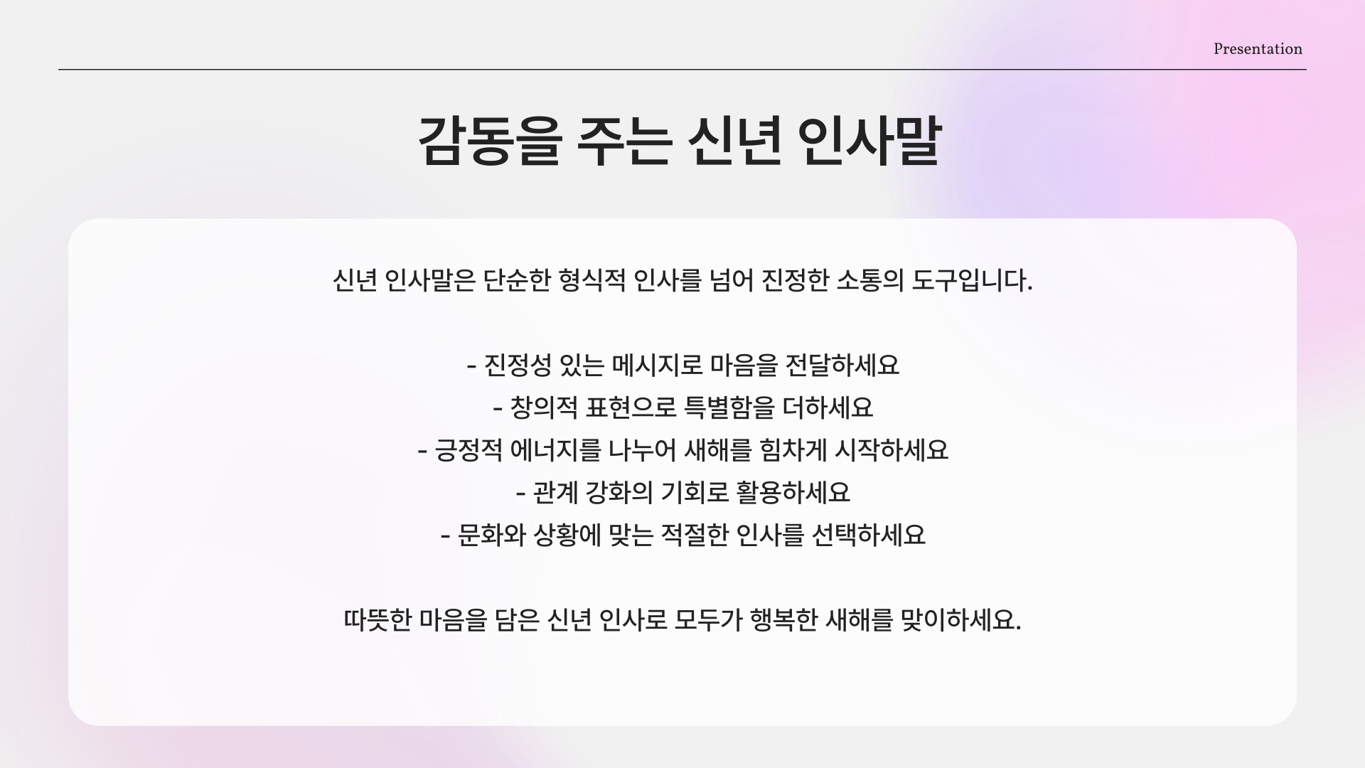 신년 인사말은 단순한 인사가 아닙니다. 누군가에게 감동을 주고, 그 사람과의 관계를 더욱 깊게 만들어주는 중요한 수단입니다.