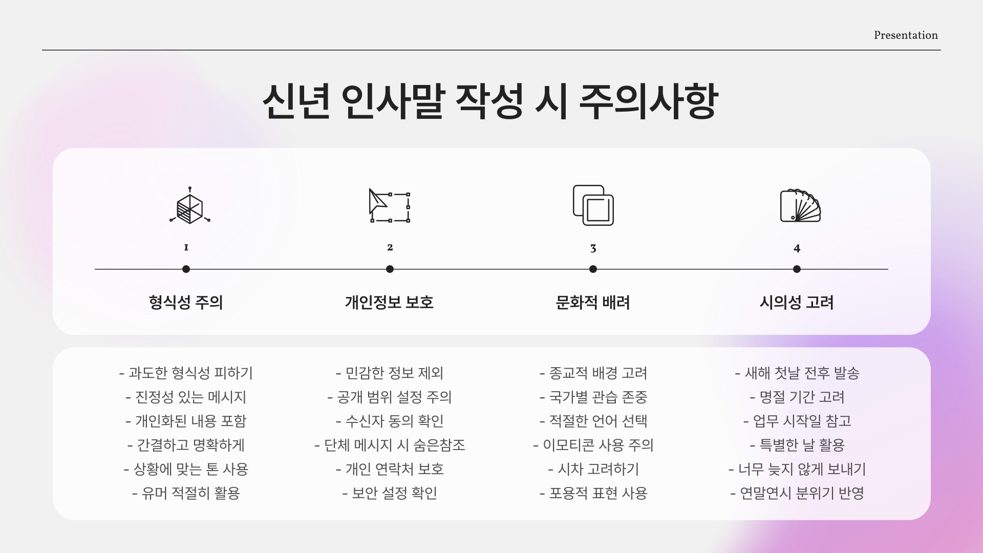 세 번째는 긍정적인 메시지를 전달하는 것입니다. 새해를 맞이하며 희망과 긍정적인 변화를 제시하는 표현을 사용하면, 받는 이에게 좋은 에너지를 줄 수 있습니다. 이를 통해 신년 인사말이 더욱 의미 있게 다가올 것입니다.