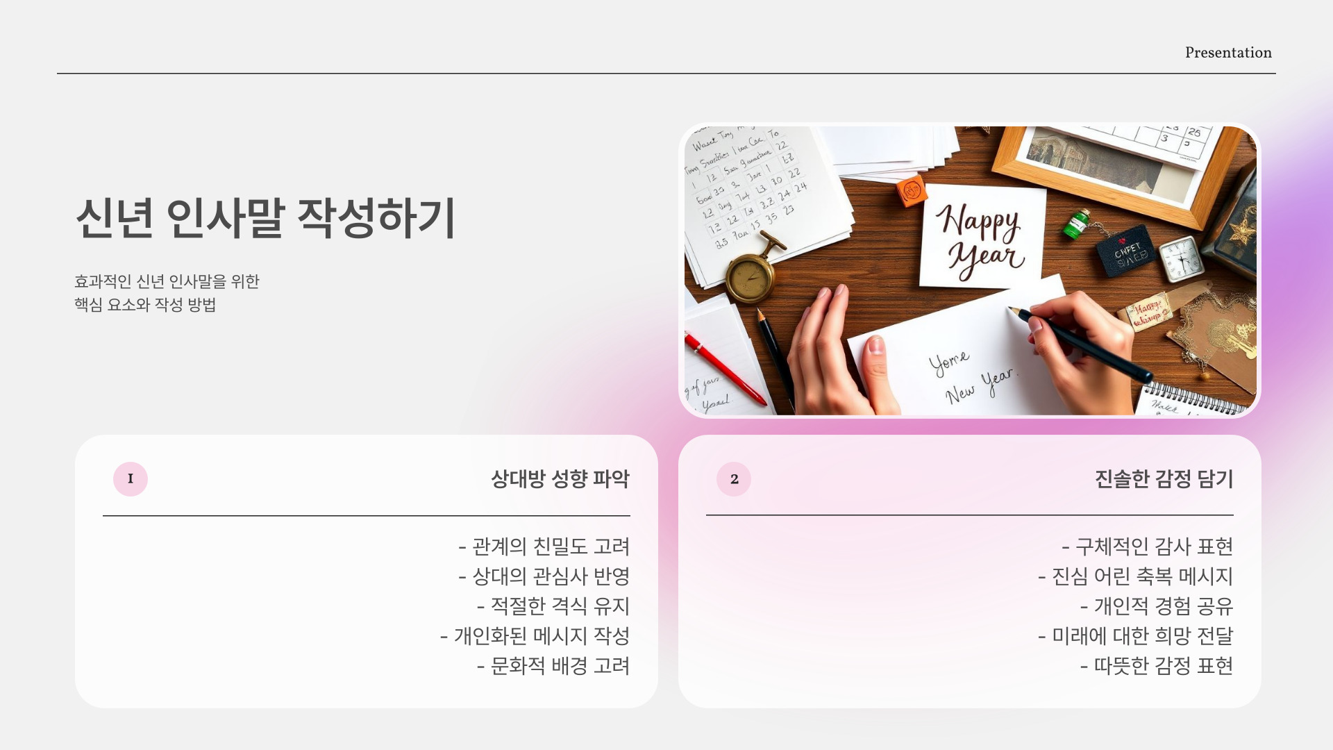 신년 인사말을 작성할 때는 몇 가지 요소를 고려해야 합니다. 첫 번째로 상대방의 성향을 파악하는 것이 중요합니다. 예를 들어, 직장 동료에게는 격식 있는 인사말이 필요할 수 있으며, 친구에게는 좀 더 자유롭고 유머러스한 표현이 적합할 수 있습니다.
