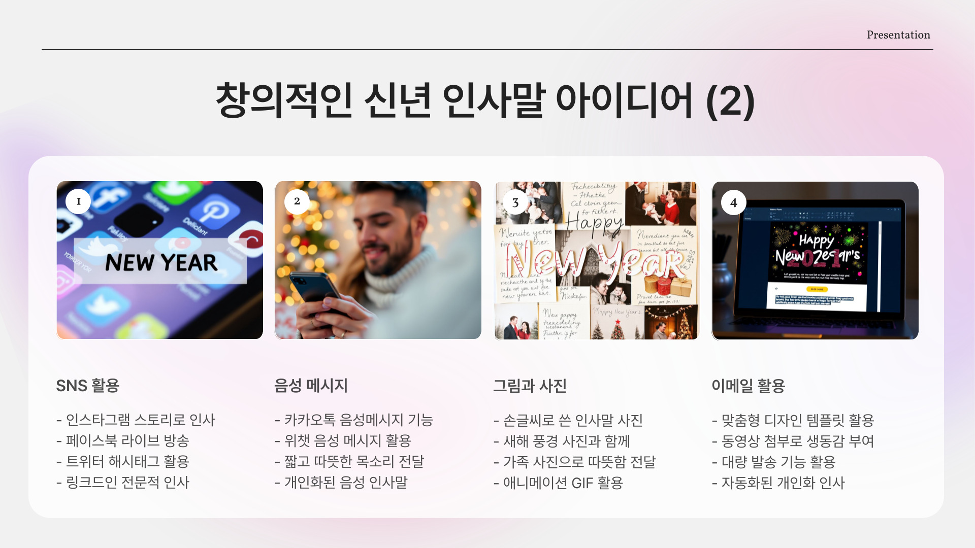 신년 인사말은 창의적으로 표현할 수 있는 다양한 방법이 있습니다. 예를 들어, 손편지나 카드에 직접 쓴 인사말은 개인적인 느낌을 줄 수 있습니다. 또한, 영상 메시지를 만들어 보내는 것도 특별한 방법입니다.