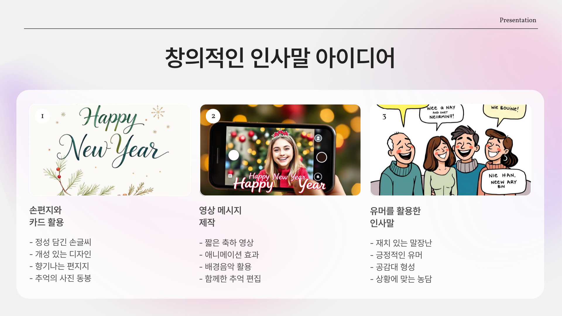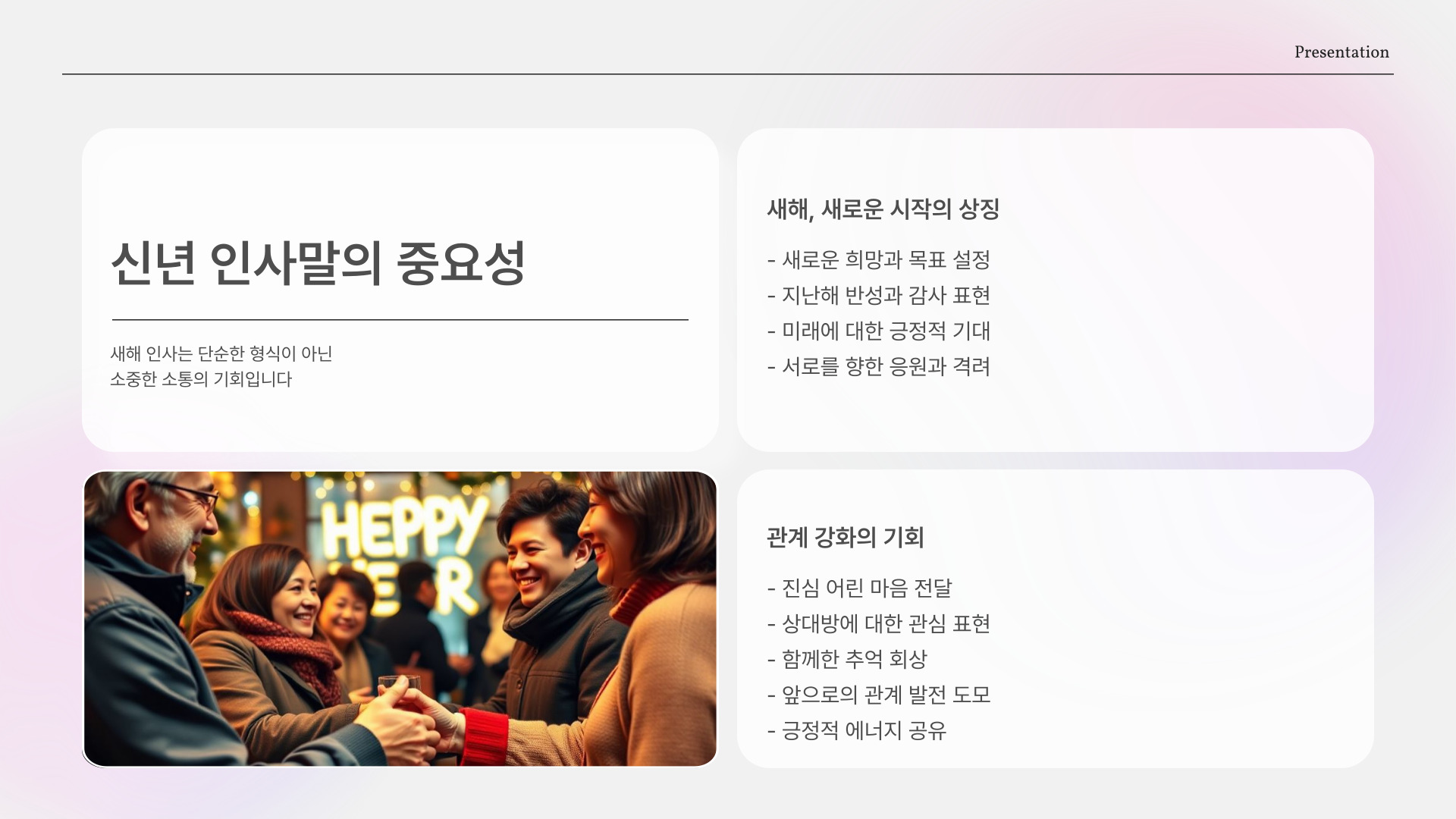 - 신년 인사말은 관계를 강화하고 긍정적인 감정을 전하는 중요한 역할을 한다.