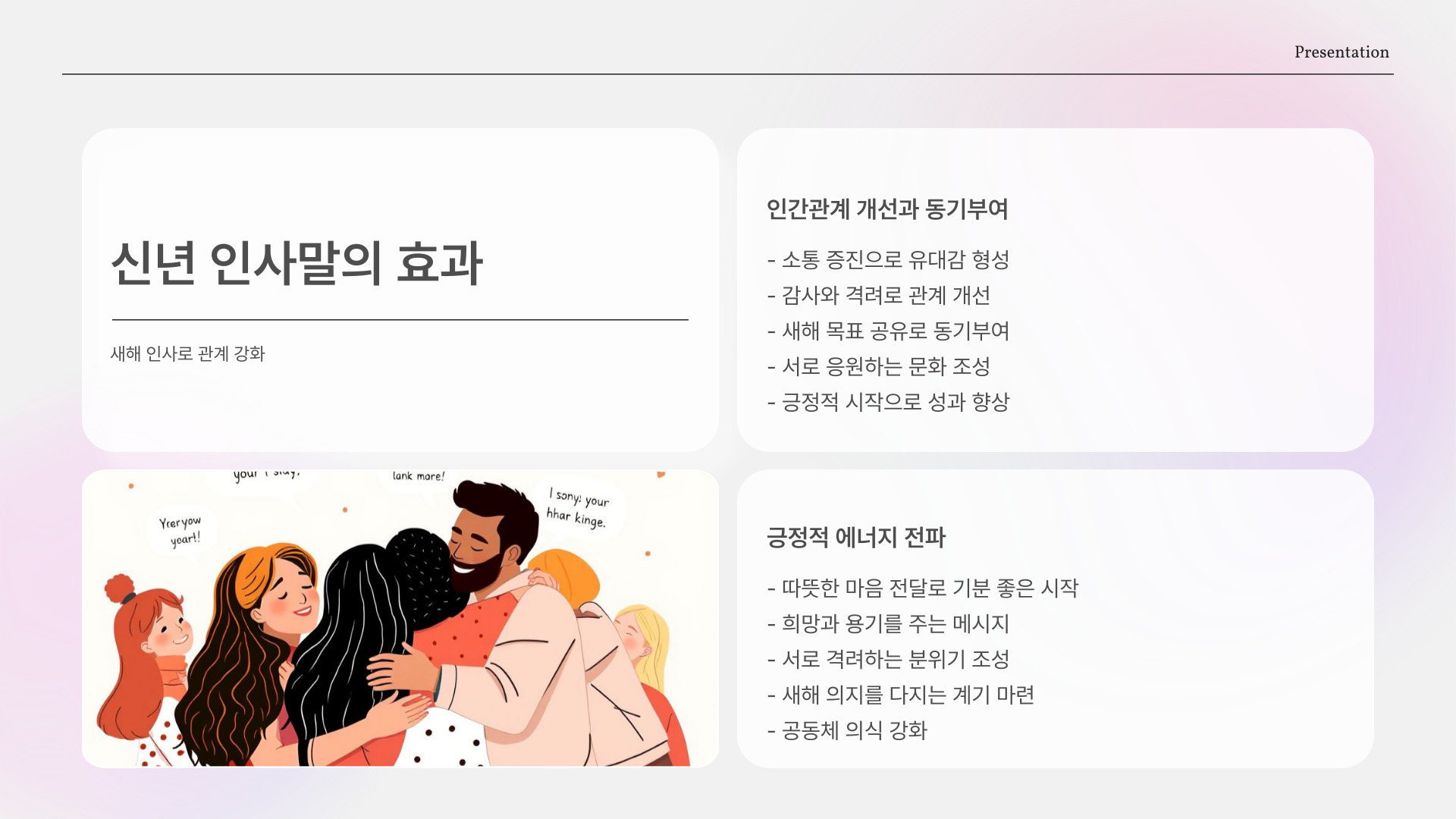 • 신년 인사말은 관계를 강화하고 긍정적인 감정을 전하는 중요한 역할을 한다.