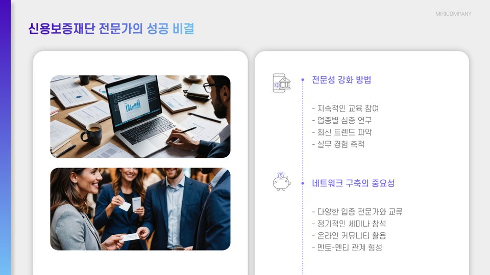 둘째, 지속적인 학습과 자기 계발이 있습니다. 신용보증재단의 전문가들은 시장 변화에 빠르게 대응하기 위해 새로운 정보를 지속적으로 습득합니다. 이들은 업계 동향과 정책 변화를 면밀히 연구하여 고객에게 최선의 솔루션을 제공하는 데 힘쓰고 있습니다.