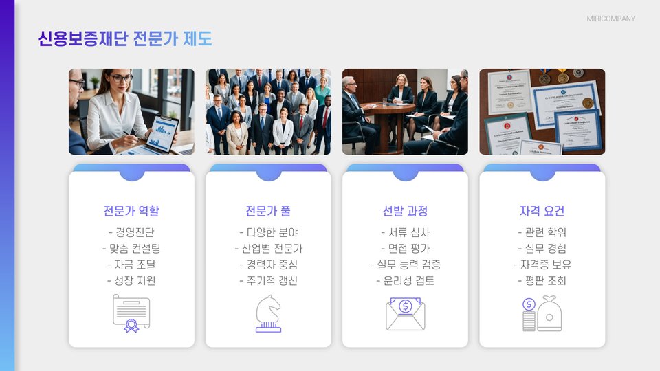- 신용보증재단은 중소기업에 재정, 컨설팅, 네트워킹 지원을 제공합니다.