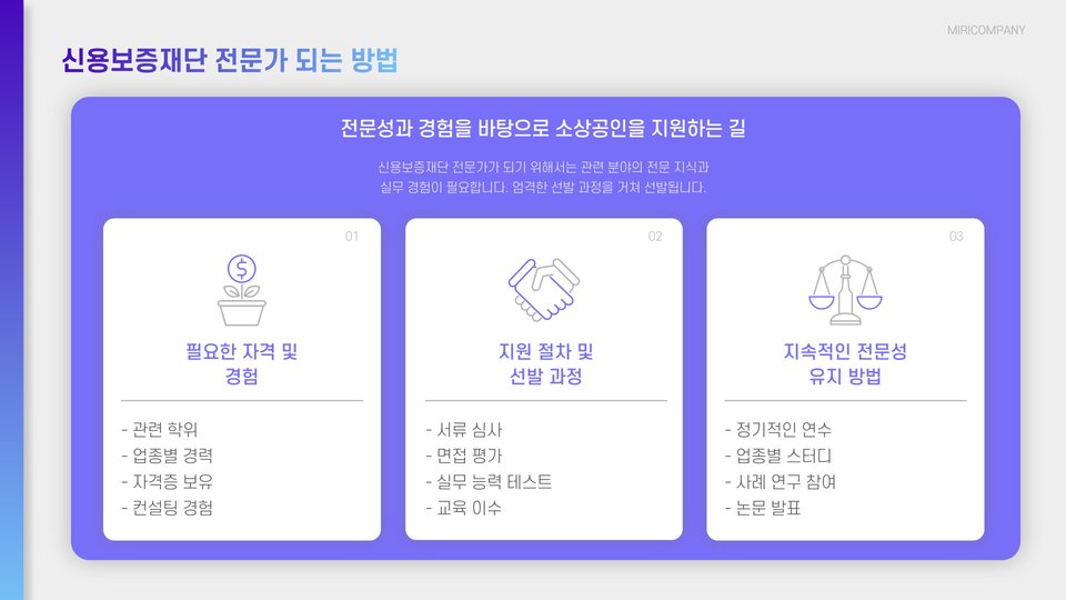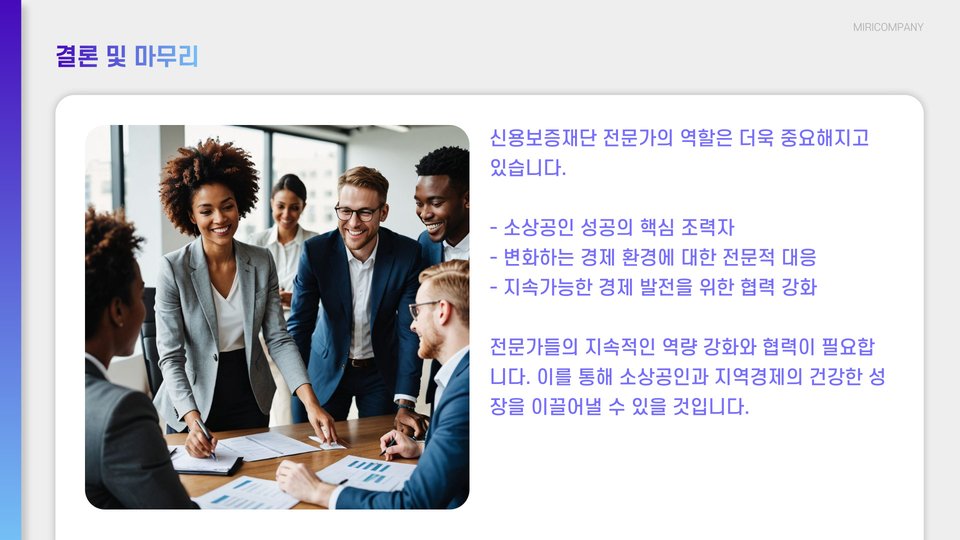 신용보증재단은 중소기업 및 소상공인에게 금융지원을 제공하여 그들의 성장을 도모하는 기관입니다. 이곳의 전문가들은 이러한 지원을 효과적으로 이끌어내기 위해 다양한 혜택과 성공비법을 갖추고 있습니다. 이를 통해 중소기업이 시장에서 지속적으로 경쟁력을 유지할 수 있도록 도움을 주고 있습니다.