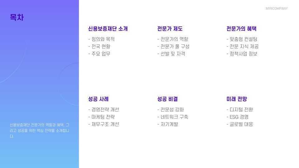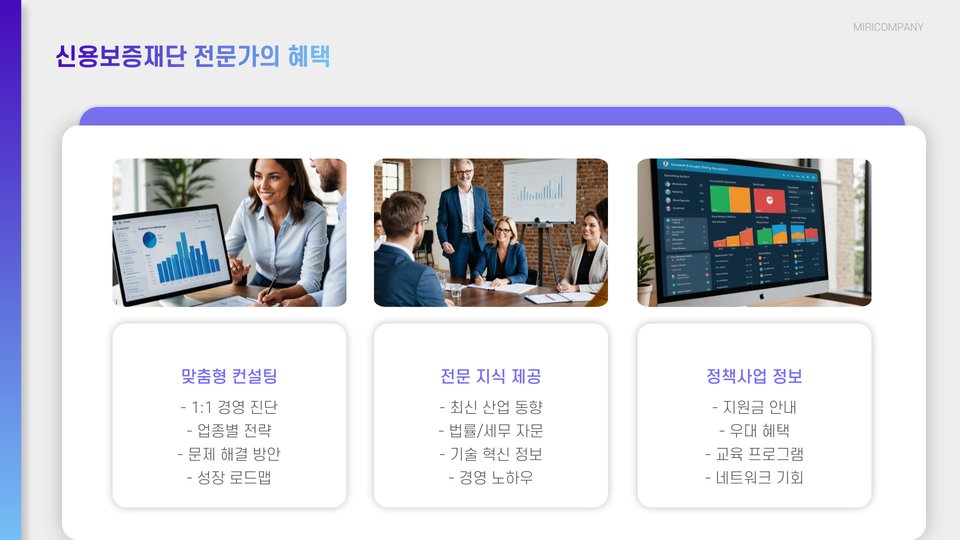 - 신용보증재단은 중소기업에 재정, 컨설팅, 네트워킹 지원을 제공합니다.