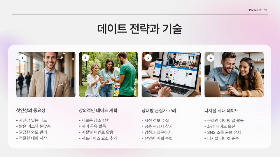 자신의 연애스타일을 파악했다면, 이제 이를 실행에 옮길 차례입니다. 성공적인 연애를 위해서는 다음과 같은 방법들이 효과적입니다. 첫째, 상대방의 스타일을 존중해야 합니다. 서로 다른 스타일을 가진 사람과의 관계에서는 이해와 존중이 필수적입니다.
