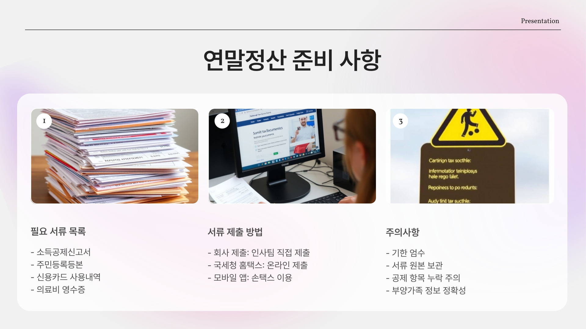 연말정산을 진행할 때 유의해야 할 점이 몇 가지 있습니다. 첫째, 신고기한을 반드시 지켜야 합니다. 기한을 놓치면 세액 공제를 받을 수 없거나, 세금을 추가로 납부해야 할 수 있습니다. 둘째, 서류를 잘 확인하고 제출해야 합니다. 잘못된 서류를 제출하면 세무조사를 받을 수 있기 때문에, 모든 서류를 꼼꼼히 검토하는 것이 중요합니다.