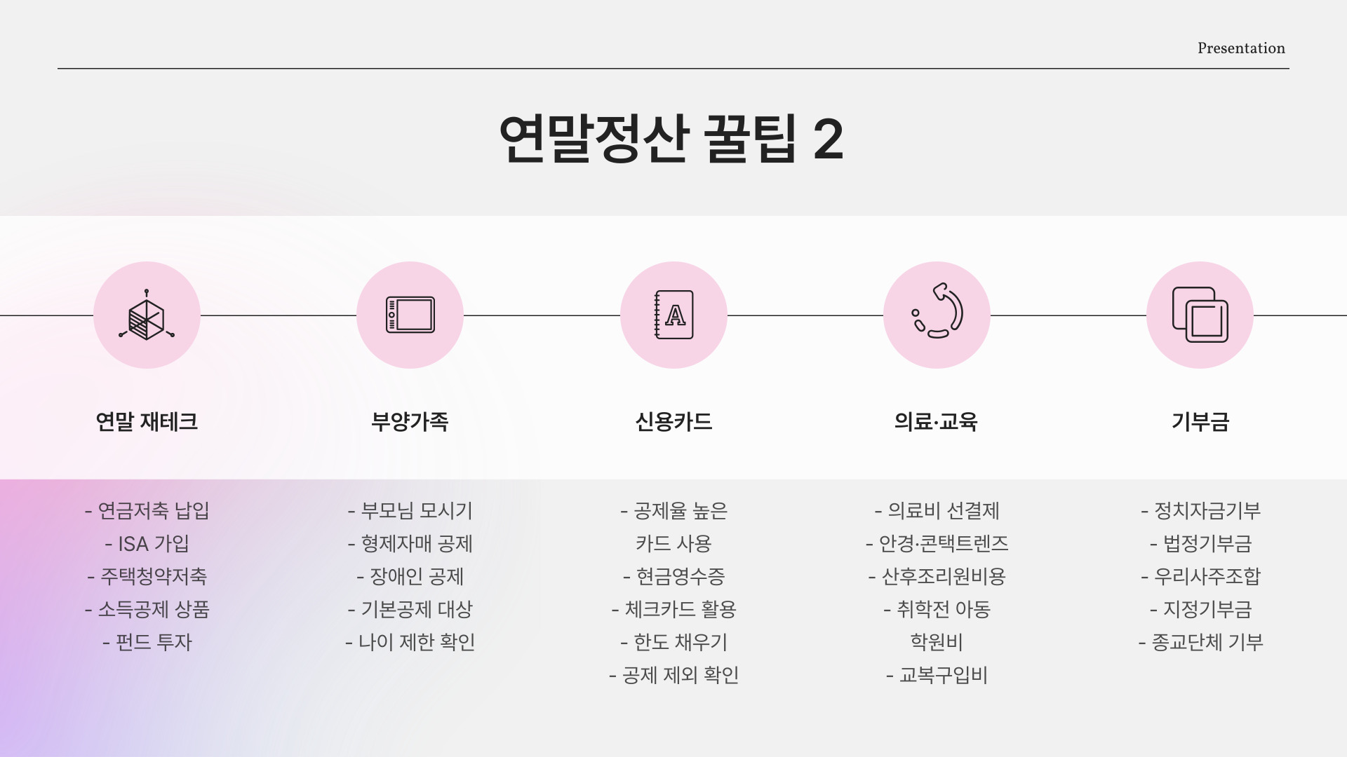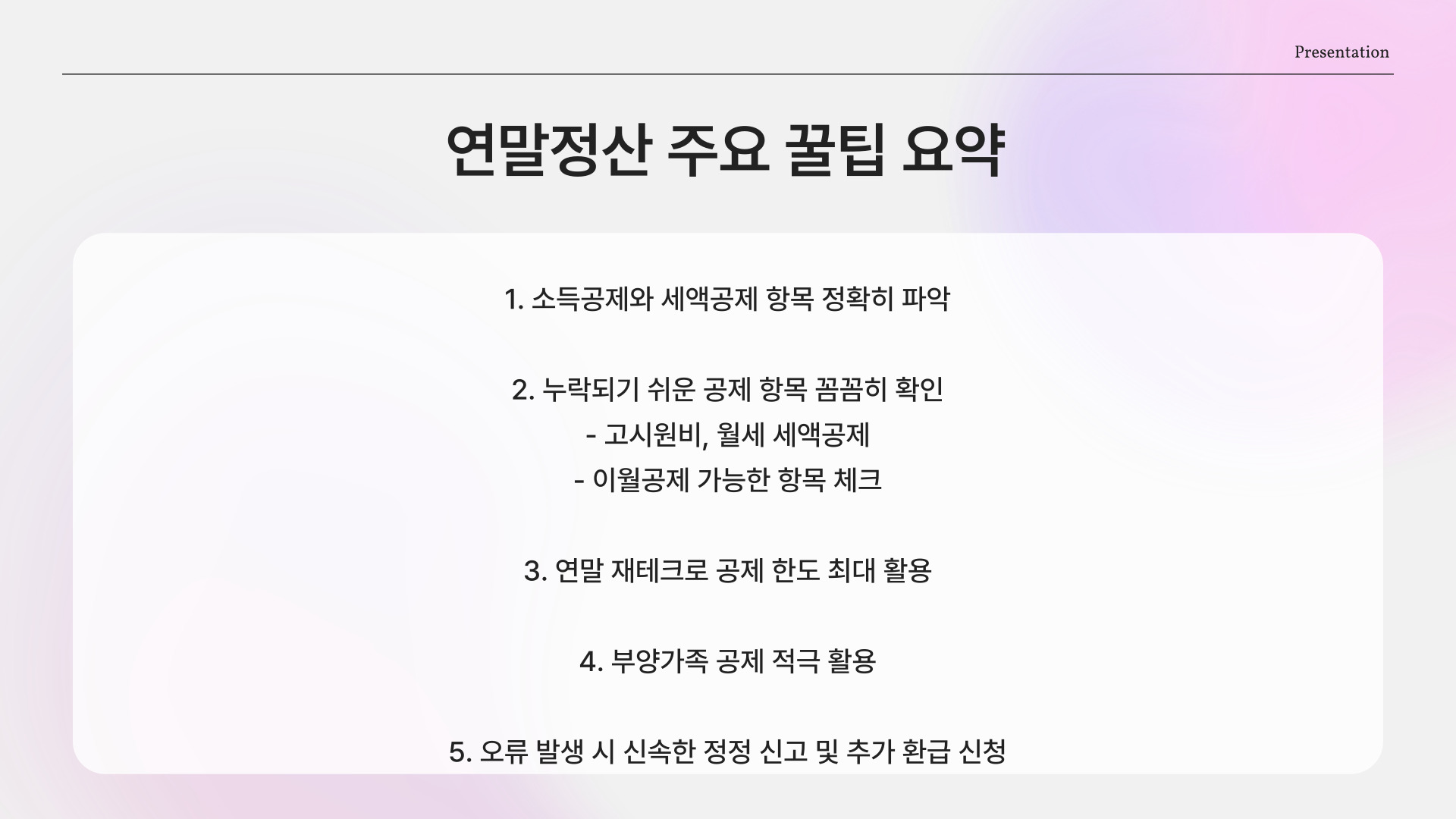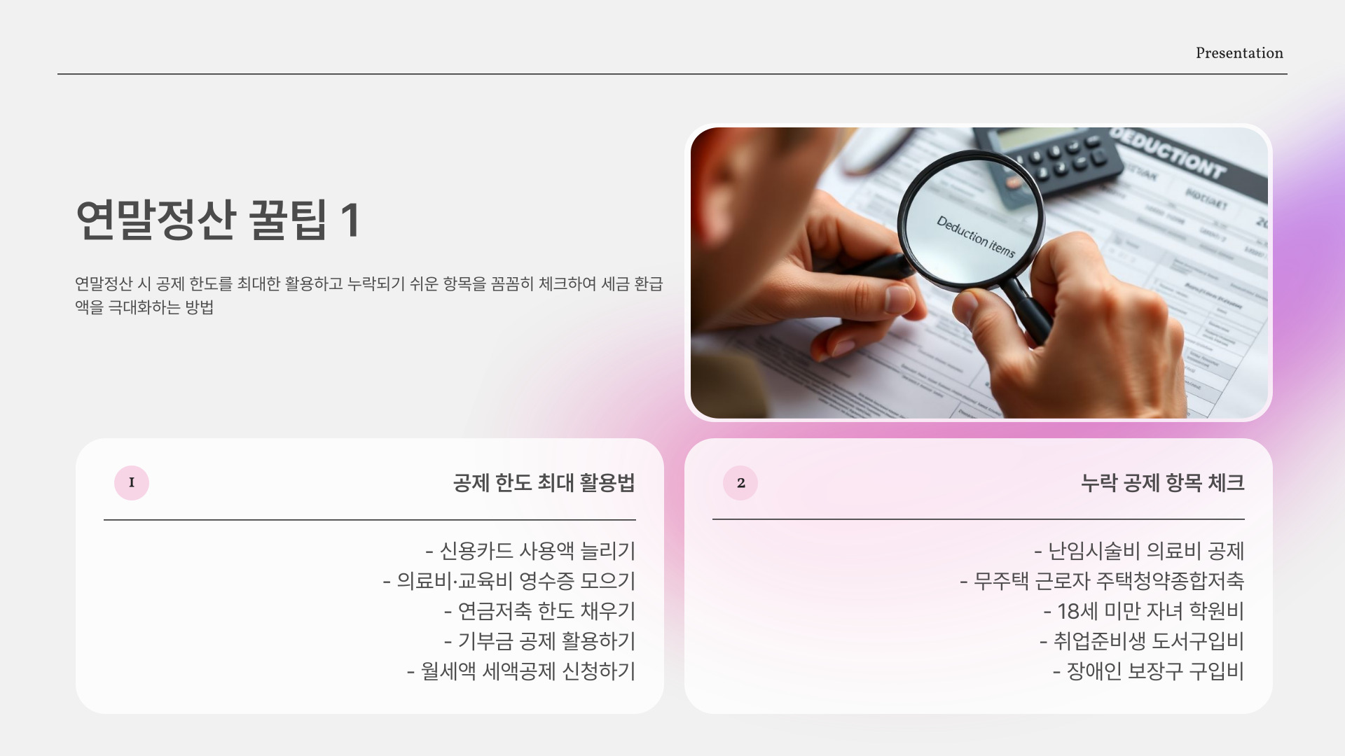 - 세액 공제를 최대한 활용하는 방법을 익히자.