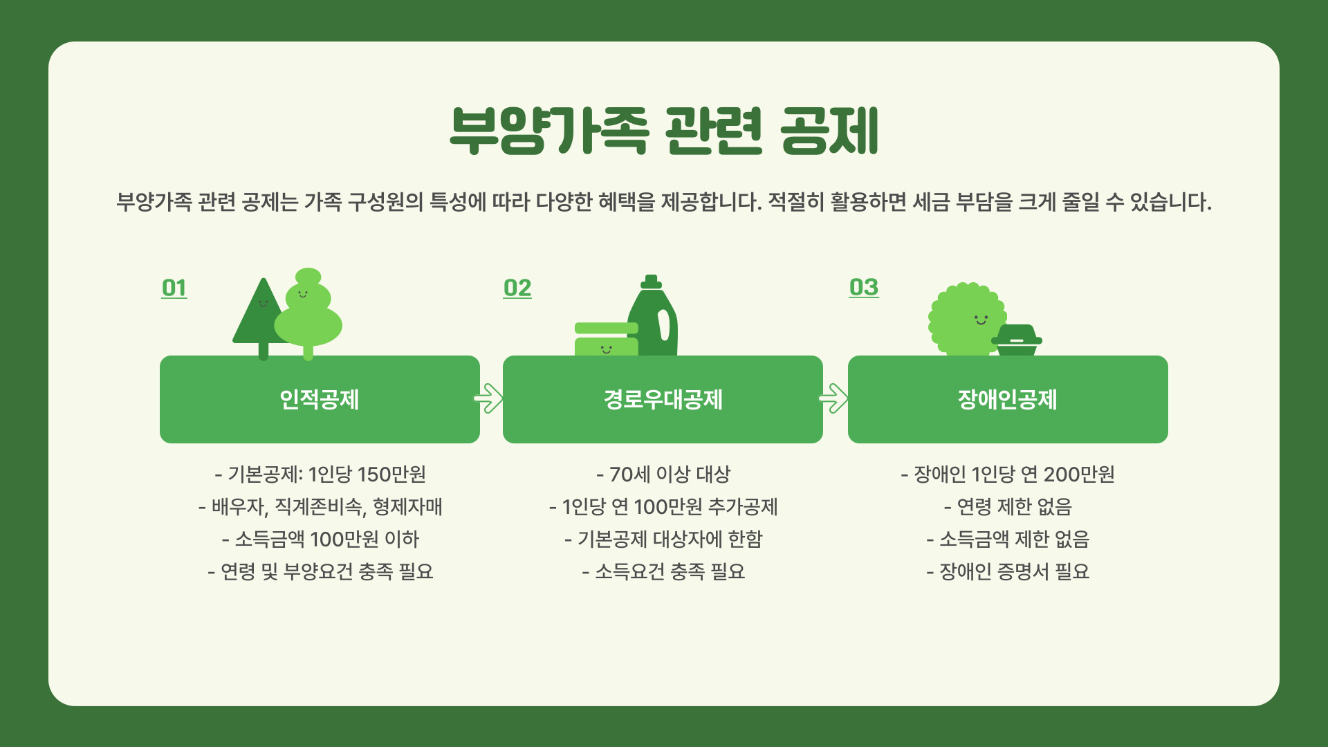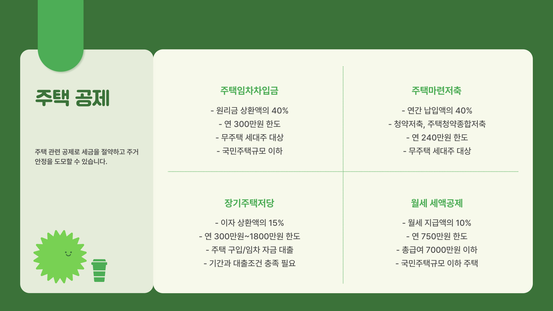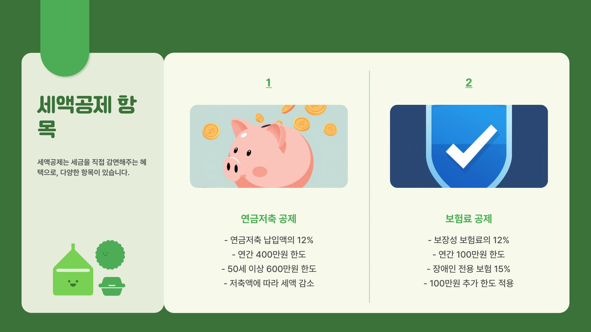 각 항목마다 공제 한도가 다르므로, 자세한 내용은 국세청 홈페이지나 관련 자료를 통해 확인하는 것이 좋습니다.