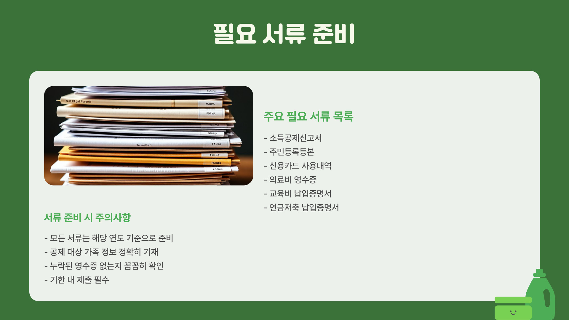연말정산을 준비하는 가장 중요한 단계는 바로 서류입니다. 필요한 서류를 미리 준비해두면, 정산 과정이 훨씬 수월해집니다. 기본적으로 준비해야 할 서류는 다음과 같습니다: