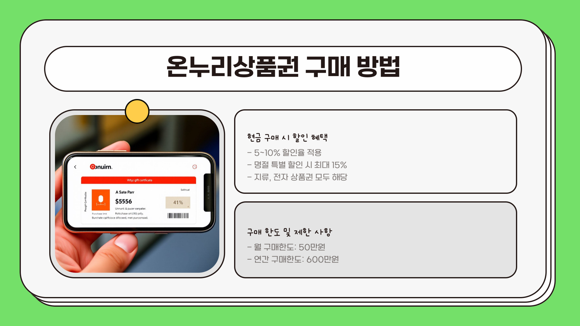 온누리상품권을 구매하는 방법은 간단합니다. 먼저, 가까운 농협이나 신협을 방문하여 상품권 구매를 요청하면 됩니다. 또한, 우체국에서도 구매가 가능하니 지역 우체국을 방문하는 것도 좋은 방법입니다. 온라인 구매를 원하시는 경우, 관련 웹사이트에 접속하여 회원가입 후 상품권을 선택하고 결제하면 됩니다. 이 과정은 빠르고 간편하여 많은 사람들이 이용하고 있습니다.