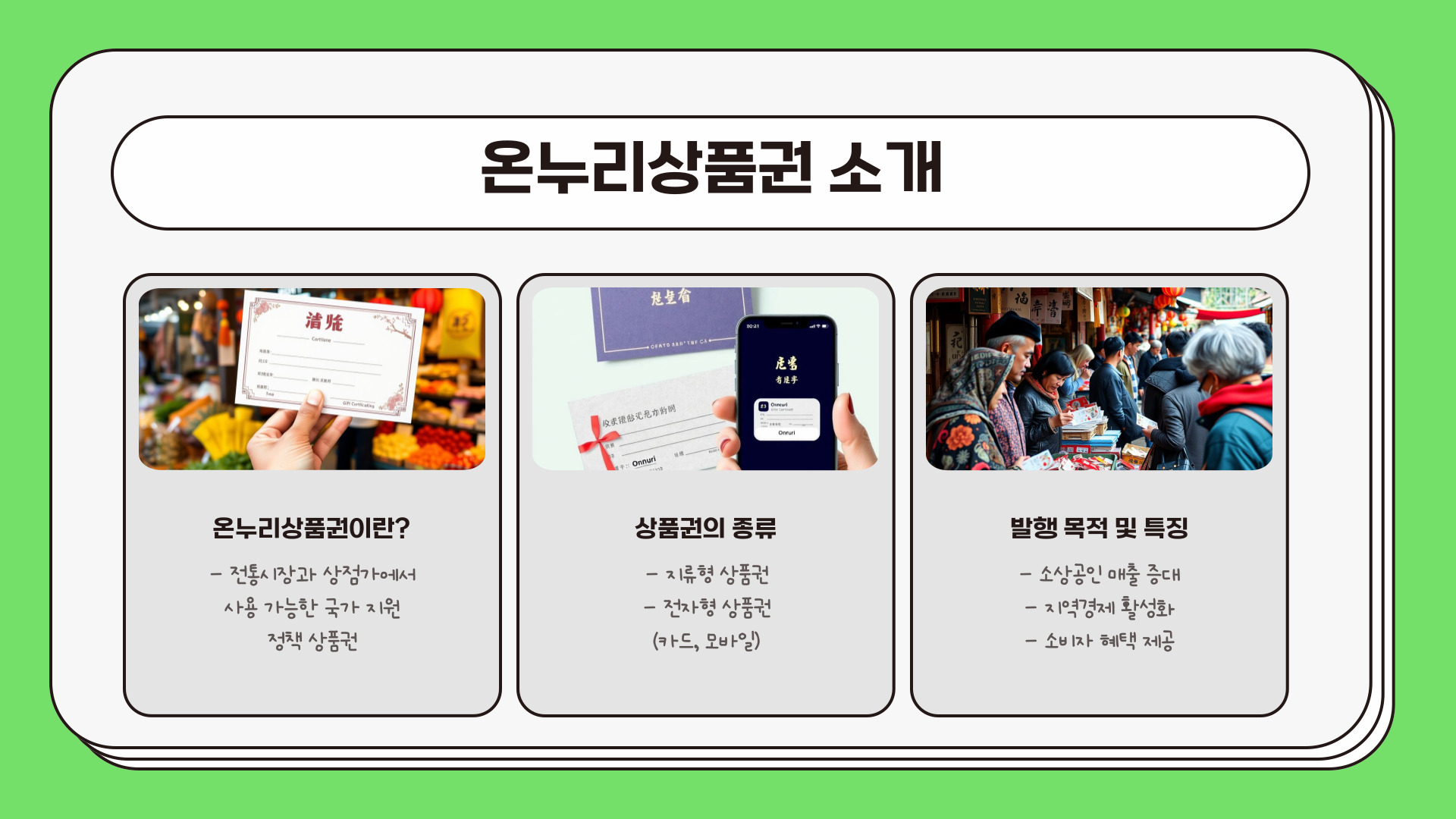 온누리상품권은 한국의 소상공인과 전통시장을 지원하기 위해 제작된 상품권입니다. 이 상품권은 특정 가맹점에서 사용할 수 있으며, 소비자에게는 다양한 혜택을 제공합니다. 예를 들어, 전통시장에서 사용할 수 있는 상품권은 지역 경제 활성화에 기여하고, 소비자에게는 할인 혜택을 제공합니다. 따라서 온누리상품권의 필요성은 소비자와 상점 모두에게 중요한 요소가 됩니다.