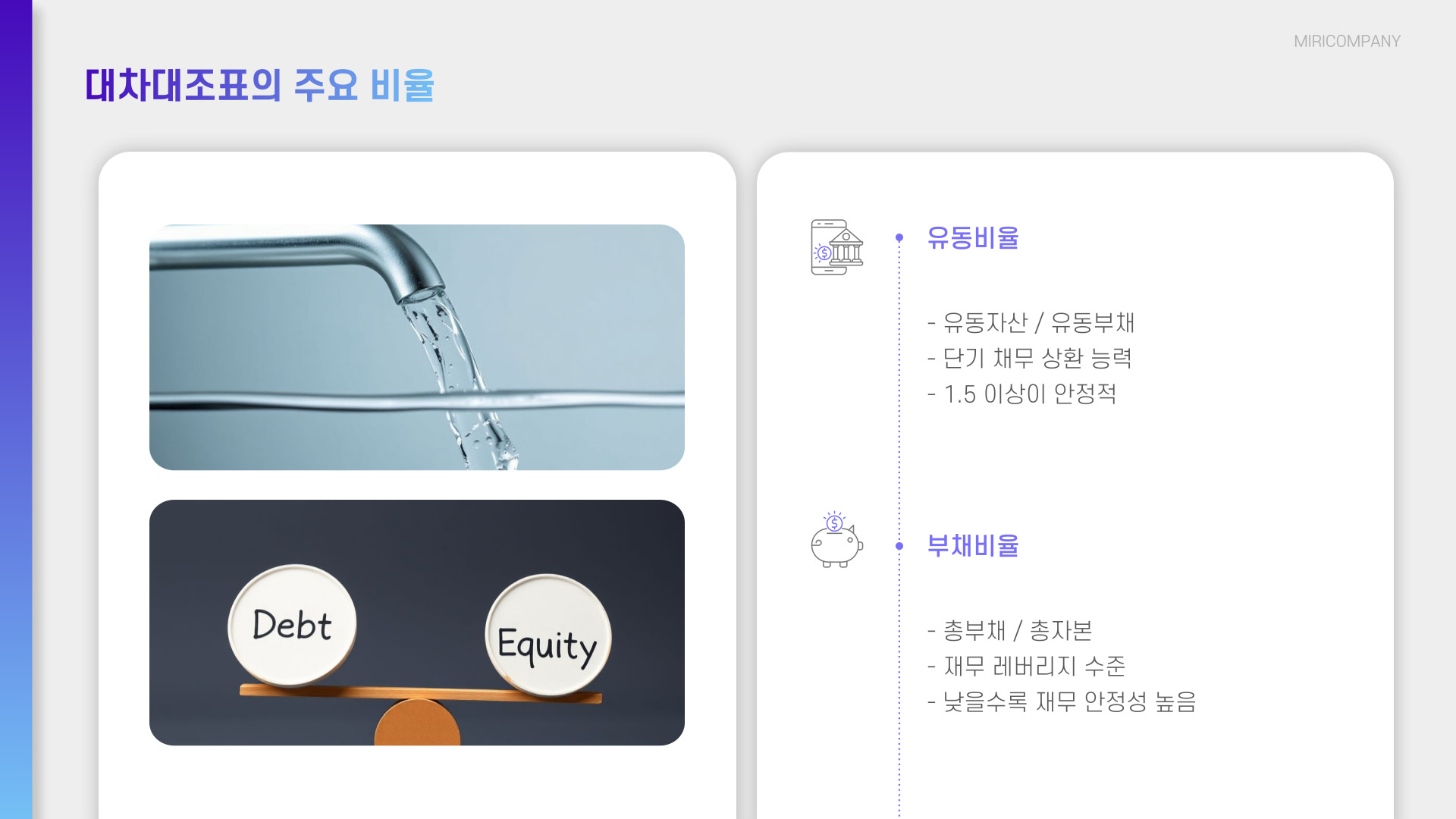 대차대조표를 분석할 때 주목해야 할 주요 비율은 유동비율과 부채비율입니다. 유동비율은 유동자산을 유동부채로 나누어 계산하며, 이는 단기 채무를 얼마나 잘 이행할 수 있는지를 보여줍니다. 일반적으로 유동비율이 1.5 이상이면 안정적인 기업으로 평가받습니다. 반면, 부채비율은 총 부채를 총 자본으로 나누어 계산하며, 기업의 재무 레버리지를 나타냅니다. 이 비율이 너무 높으면 재무 위험이 증가할 수 있습니다.