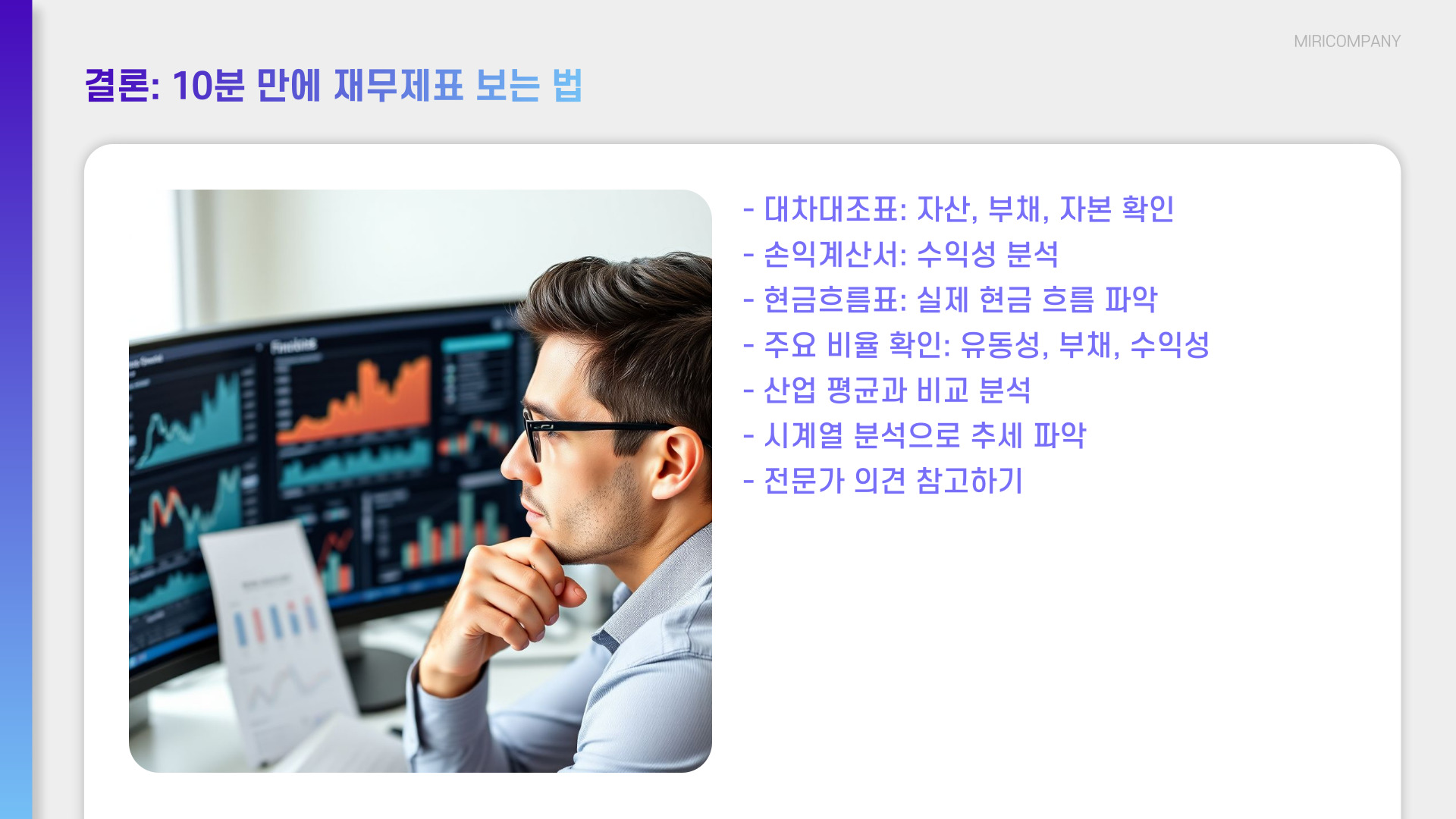 이 글을 통해 재무제표를 보는 기본적인 방법을 배우셨기를 바랍니다. 각 재무제표를 잘 이해하면 기업의 건강 상태를 빠르게 파악할 수 있으며, 이를 통해 투자 결정을 내리는 데 도움이 될 것입니다. 이제 여러분도 10분 만에 재무제표를 이해하고 활용해 보세요!