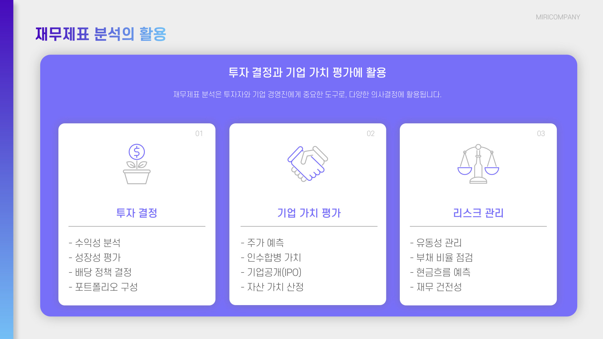 - 비율 분석: 다양한 재무 비율을 비교하여 기업의 재무 건전성을 평가합니다.