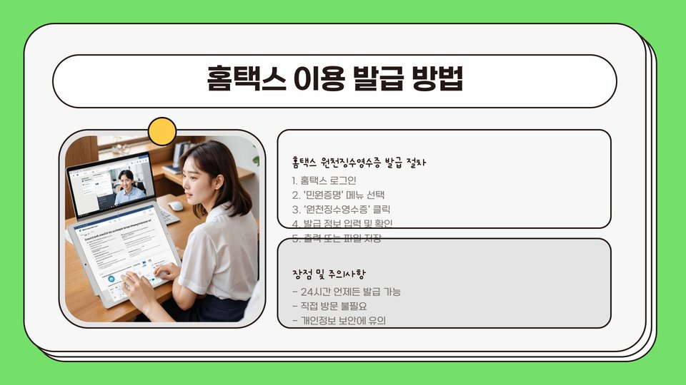 홈택스에 접속하여 개인 정보 입력 후, 원하는 원천징수영수증을 선택하면 발급이 가능합니다. 장점으로는 시간과 비용을 절약할 수 있다는 점이 있습니다. 또한, 언제 어디서든 인터넷만 있으면 쉽게 접근할 수 있어 매우 편리합니다.