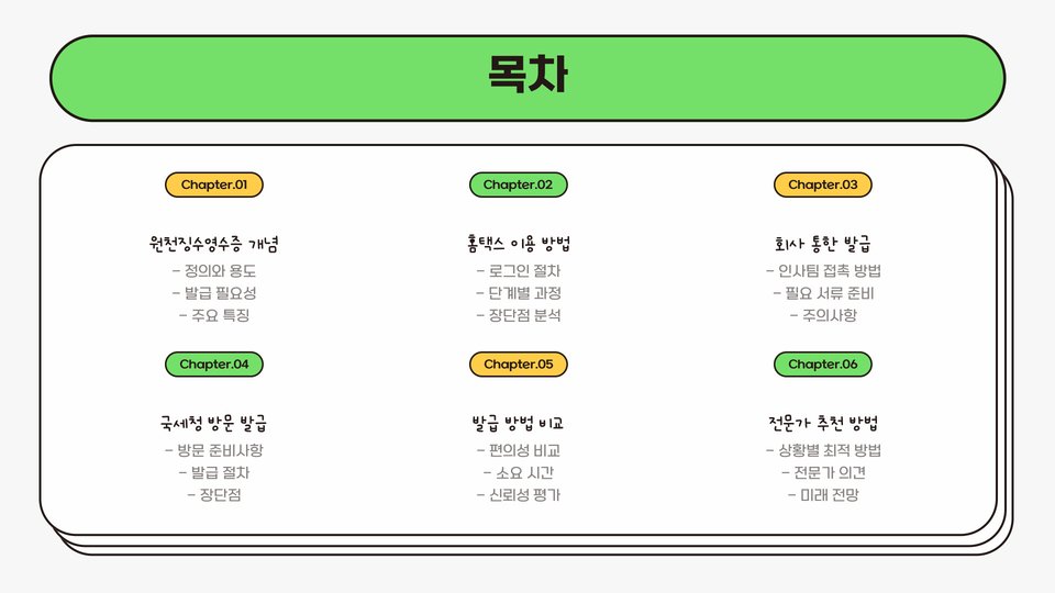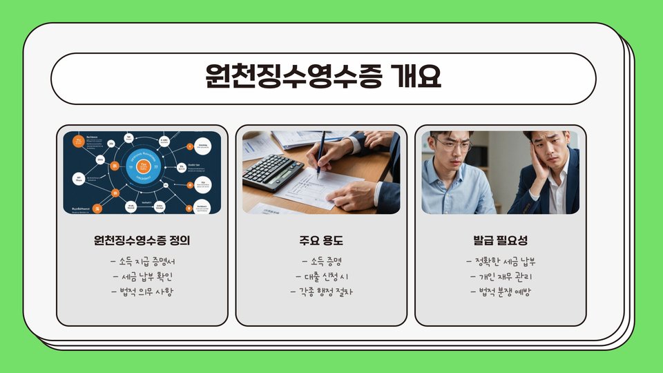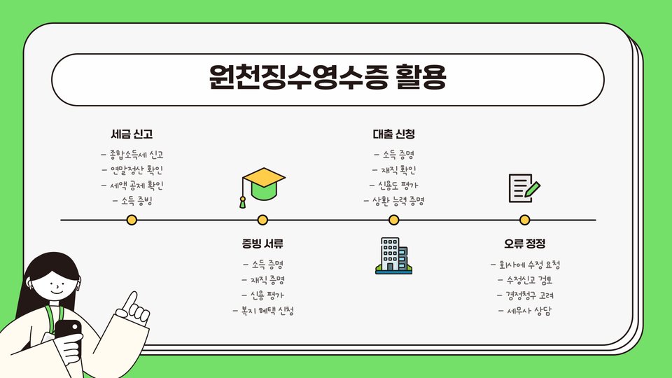원천징수영수증은 세금 신고 및 정산에 필수적인 문서입니다. 이를 통해 근로소득이나 사업소득에 대한 세금이 어떻게 원천적으로 징수되었는지를 확인할 수 있습니다. 올바른 원천징수영수증 발급 방법을 아는 것은 세금을 효율적으로 관리하고, 불필요한 세금 리스크를 피하는 데 매우 중요합니다.