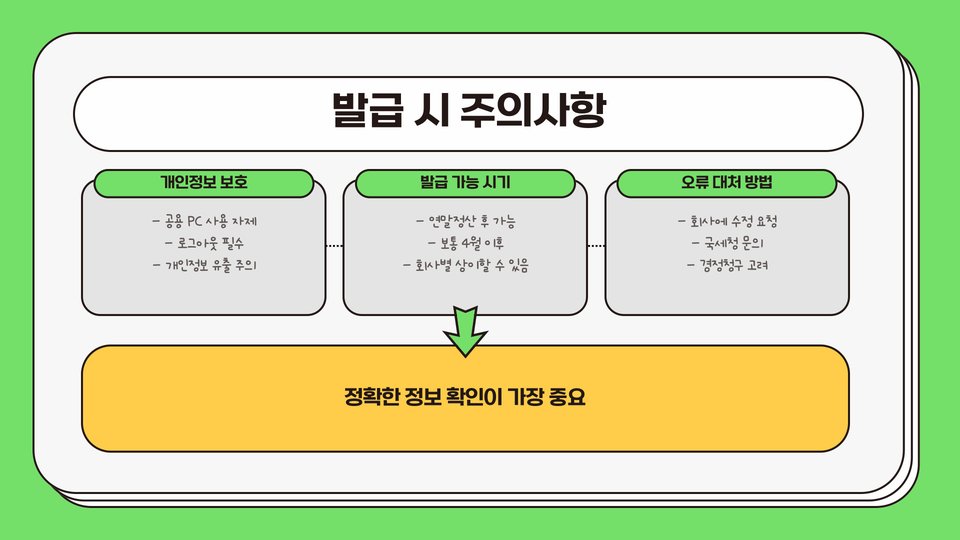 하지만 이 방법은 기업에서 이미 원천징수 내역을 신고한 경우에만 가능하므로, 개인사업자나 소규모 사업자의 경우에는 미리 준비가 필요합니다.