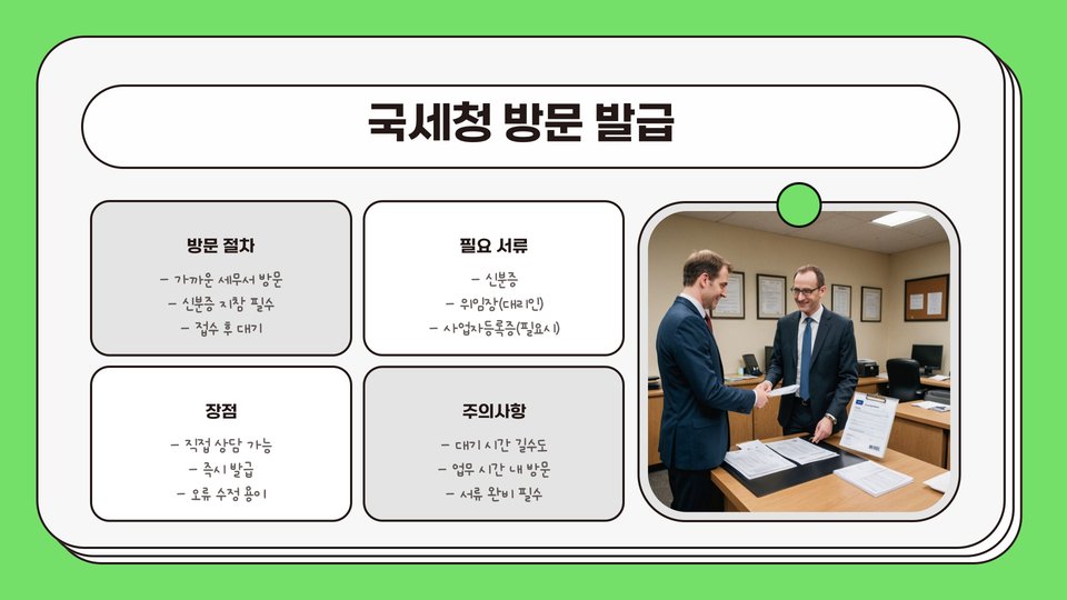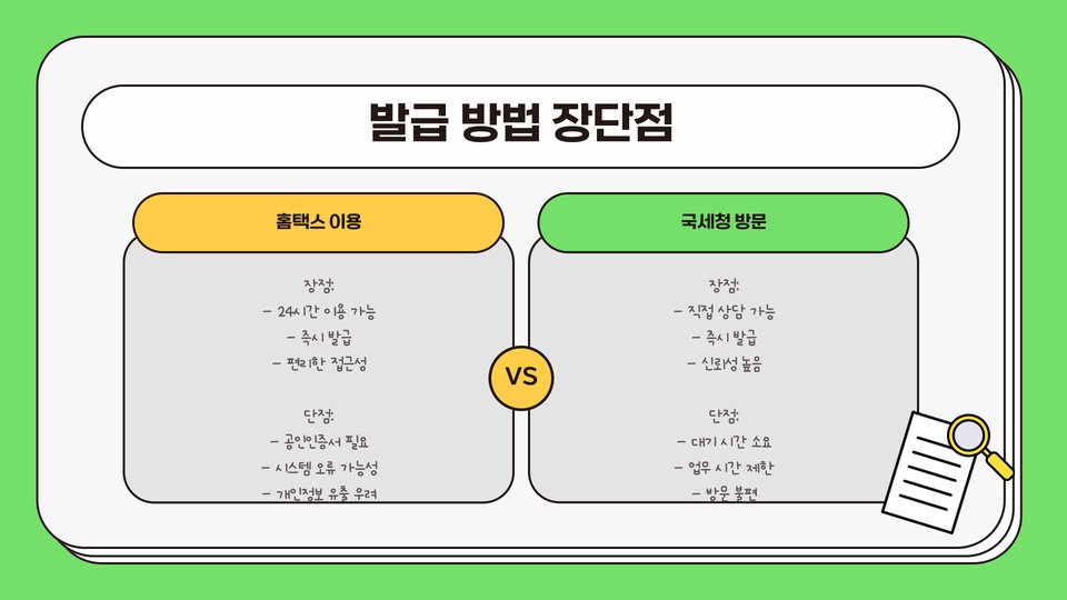 온라인 발급은 빠르고 편리하지만 기업 신고가 필요하며, 세무서 방문은 직접 상담이 가능하지만 대기 시간이 길어질 수 있습니다. 마지막으로 우편 신청은 집에서 편리하게 신청할 수 있지만, 처리 시간이 길다는 단점이 있습니다.