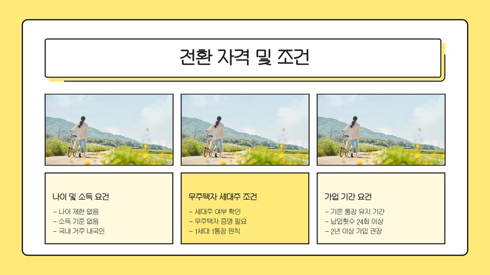 • 전환 후에는 기존 청약통장의 조건이 사라지므로 신중하게 결정하세요.
