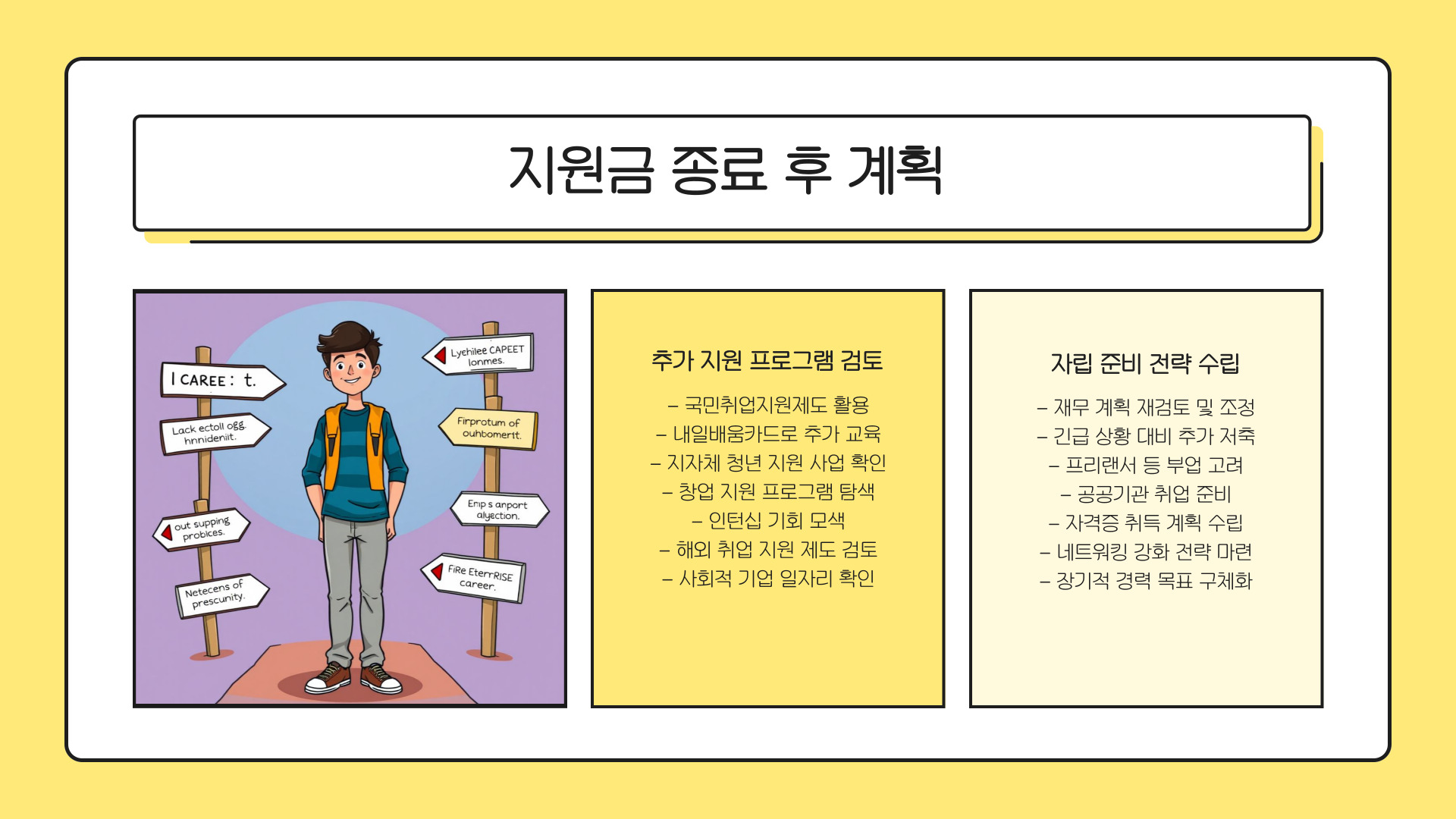 또한, 지원금이 끝난 이후에도 지속적으로 구직 활동을 이어나갈 수 있도록 자기공부나 관련 스킬을 키우는 것이 필요합니다. 현업에서 필요한 자격증이나 교육 프로그램을 통해 자기계발을 할 수 있습니다.