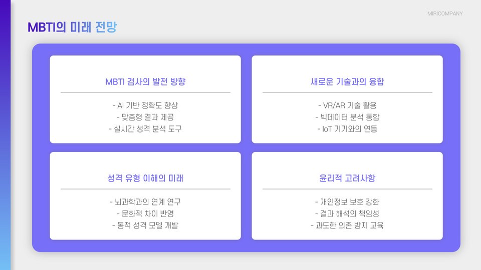 또한, 다양한 인지 과학 연구를 바탕으로 한 심화 분석도 이루어지고 있으며, MBTI 검사를 통해 얻은 성격 유형을 바탕으로 개인의 직업적 적성과 취향을 분석하는 서비스도 많이 제공되고 있습니다. 이처럼 MBTI 검사는 실생활과 밀접하게 연결되어 있음을 보여줍니다.