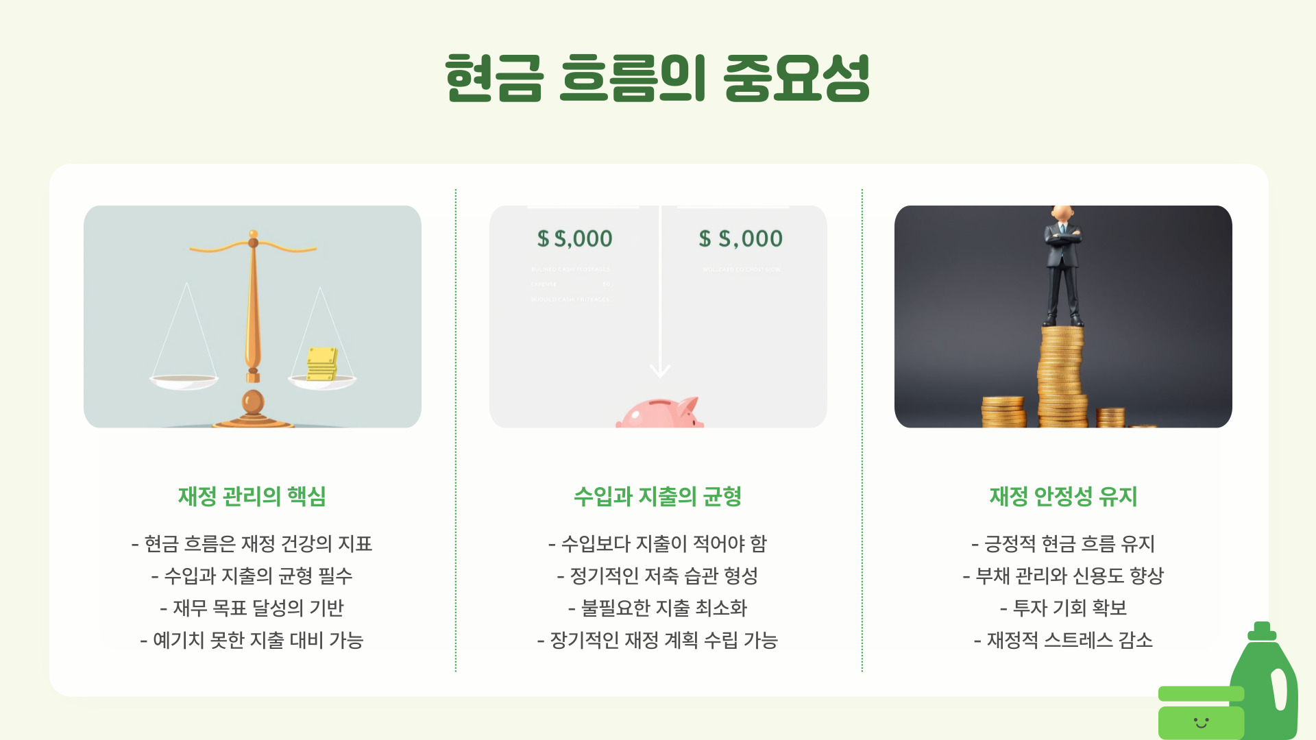 현금 흐름은 재정 관리의 핵심입니다. 수입이 지출을 초과하면 재정적으로 안정적인 상태를 유지할 수 있습니다. 반면, 지출이 수입을 초과하면 빚이 쌓이고 재정 위기에 처할 수 있습니다. 따라서 현금 흐름을 정기적으로 체크하고 조정하는 것이 중요합니다. 이를 통해 예기치 못한 지출에 대비하고, 저축을 늘릴 수 있는 기회를 만들어갑니다.