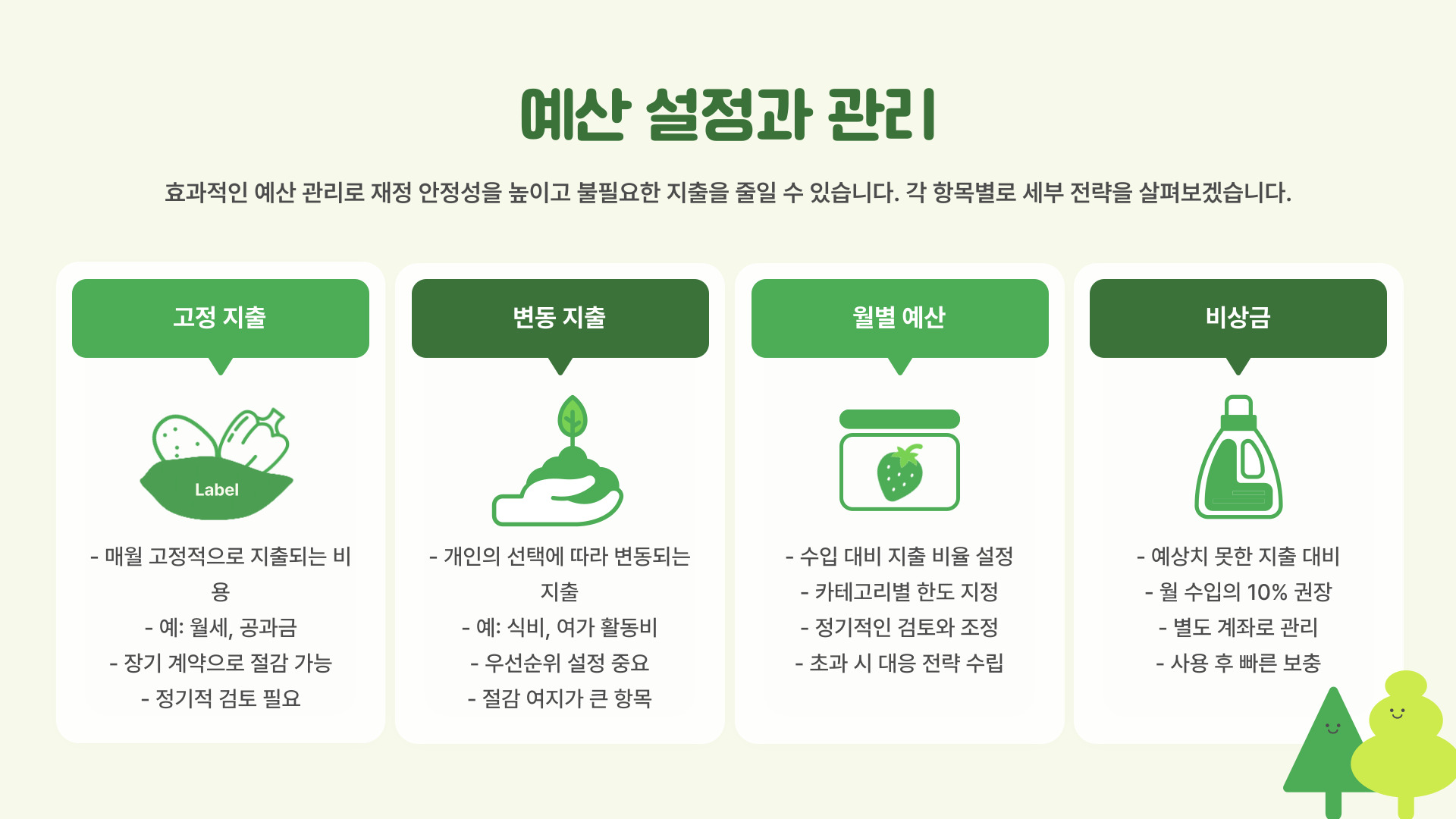 예산을 설정하는 것은 현금 흐름을 관리하는 데 필수적입니다. 매달 고정 지출과 변동 지출을 나누어 예산을 짜보세요. 고정 지출은 월세나 공과금처럼 매달 정해진 금액이 들어가는 항목입니다. 변동 지출은 식비, 쇼핑 등 개인의 소비 패턴에 따라 달라집니다. 예산을 세우고 이를 준수하는 것이 돈을 절약하는 데 큰 도움이 됩니다.