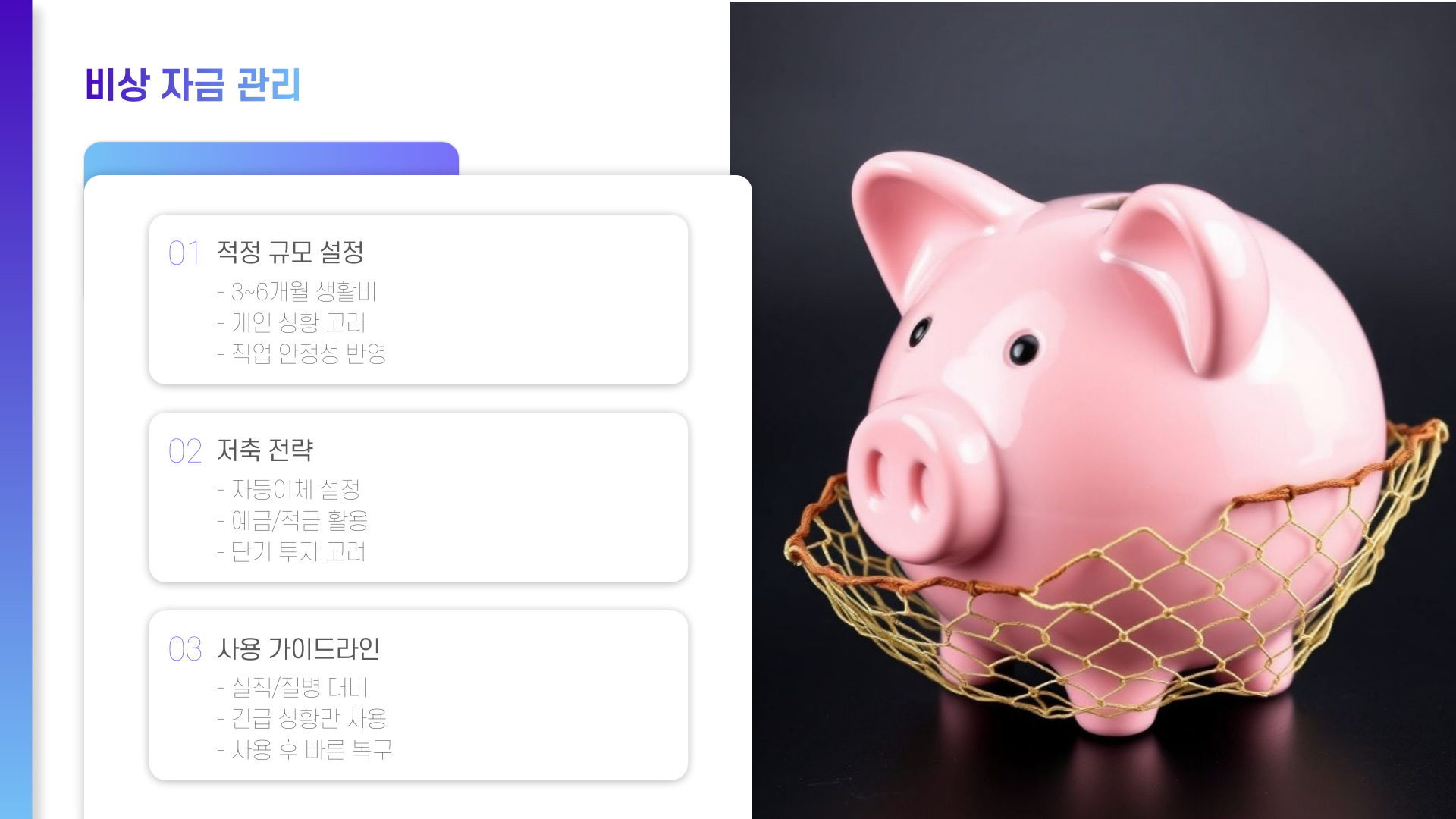 - 비상 자금 마련: 예상치 못한 지출을 대비하기 위해 최소 3개월 이상의 생활비를 저축합니다.