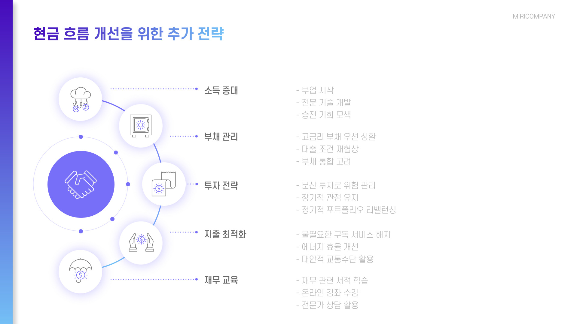 비용 관리 또한 현금 흐름을 최적화하는 데 중요한 요소입니다. 효율적인 비용 구조를 갖추기 위해서는 각종 비용의 구조를 분석해야 합니다. 광범위한 지출을 줄이고, 필요한 자원에 집중하도록 합니다. 기술 발전에 따라 자동화된 시스템을 도입하면 인건비 절감효과도 기대할 수 있습니다.