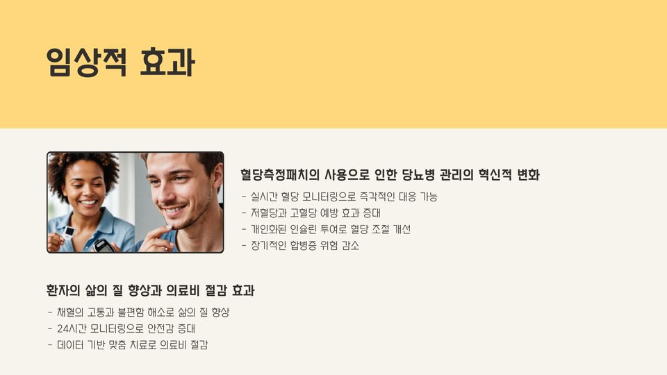 또한 실시간 모니터링이 가능하다는 점도 중요한 장점입니다. 혈당 수치가 급격히 변동하는 경우 즉시 알림을 받을 수 있어, 적절한 조치를 취할 수 있는 기회를 제공합니다. 이는 당뇨환자들이 건강을 관리하는 데 큰 도움이 됩니다.
