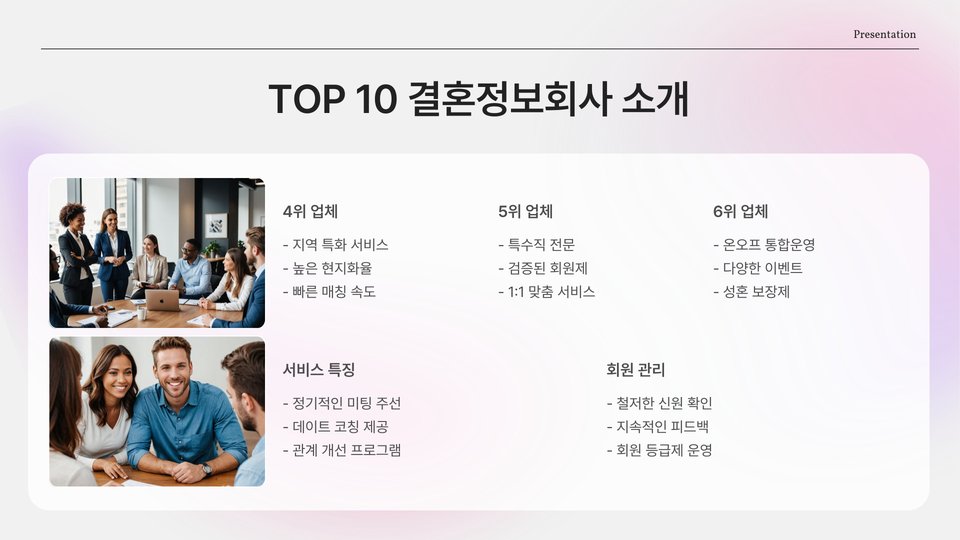 이제 본격적으로 2025년 결혼정보회사 가입비를 기준으로 추천할 만한 TOP 10 업체를 살펴보겠습니다. 각 업체의 특징과 가입비를 비교하여, 여러분의 선택에 도움이 될 수 있도록 하겠습니다. 이 목록은 각 회사의 신뢰성과 고객 만족도를 바탕으로 선정되었습니다.