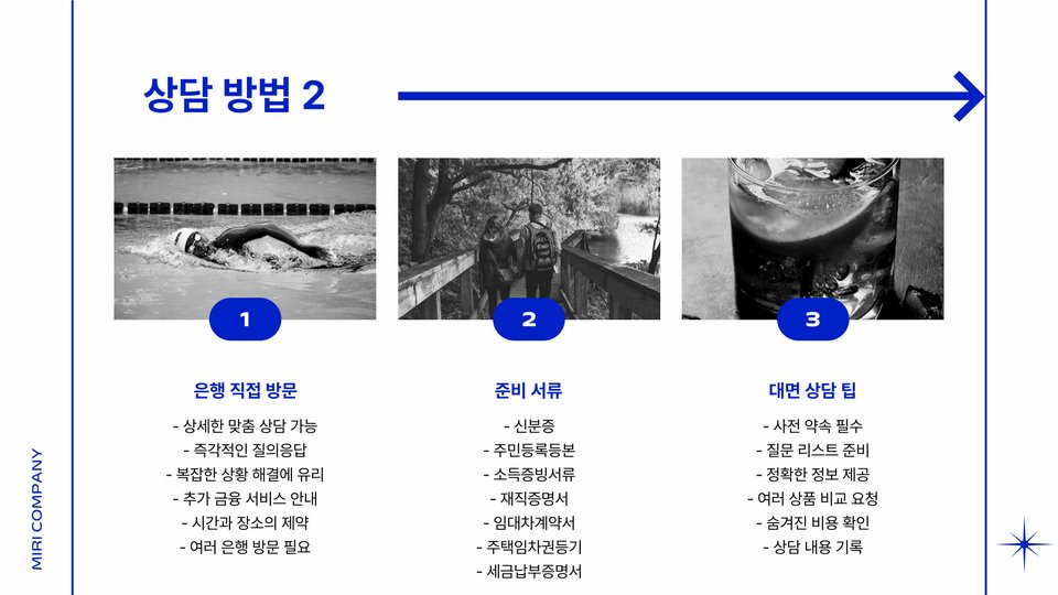 대면 상담의 장점 중 하나는 자신의 상황을 상세히 설명하고 꼼꼼한 답변을 받을 수 있다는 것입니다. 상담 시 들어가는 시간은 다소 길어질 수 있지만, 궁극적으로 적절한 대출 상품을 선택하는 데 큰 도움이 됩니다.