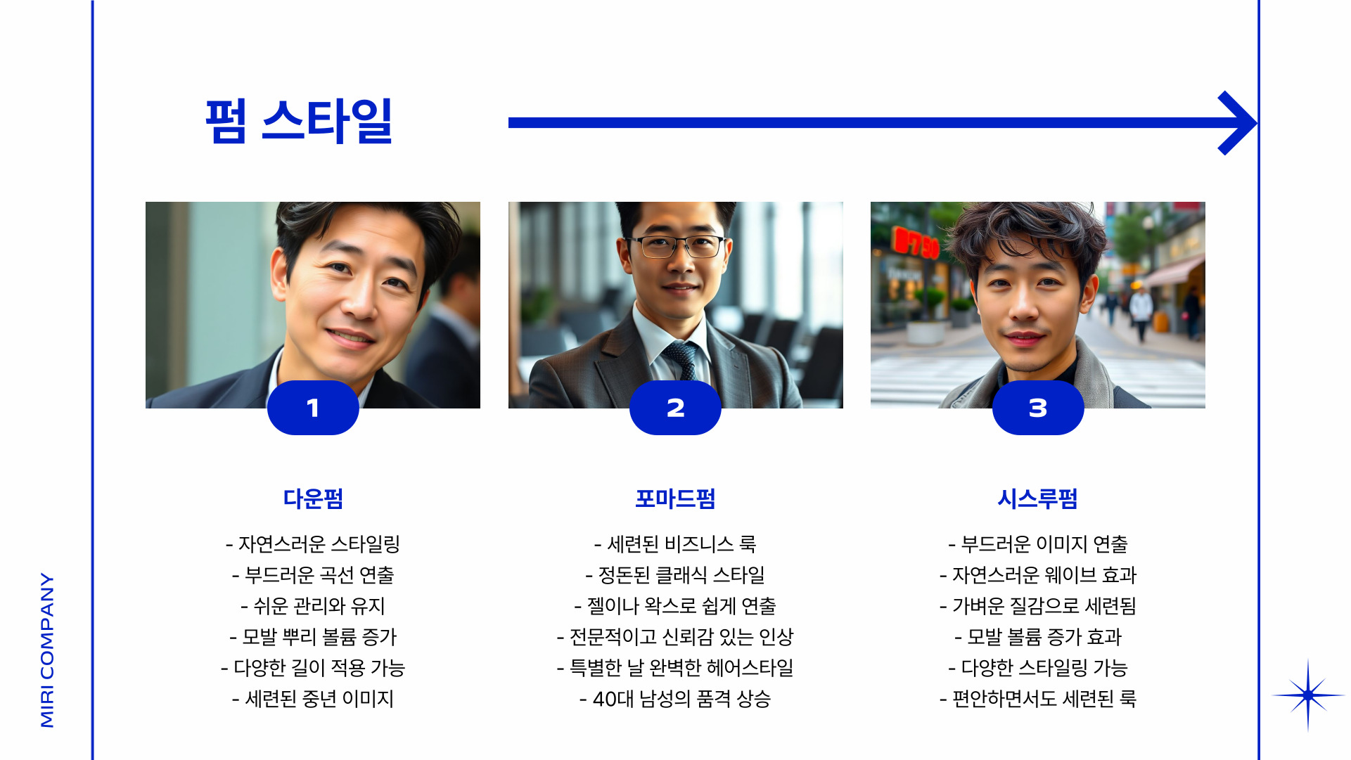 부드러운 웨이브는 텍스처를 강조하여 세련되면서도 부드러운 이미지를 주며, 대범한 내추럴 볼륨은 너무 강하지 않은 볼륨감을 제공하여 오히려 자연스러운 느낌을 줍니다. 그리고 리프팅 펌은 나이와 상관없이 젊음을 느끼게 해주는 스타일로, 많은 40대 남성들이 선호합니다.