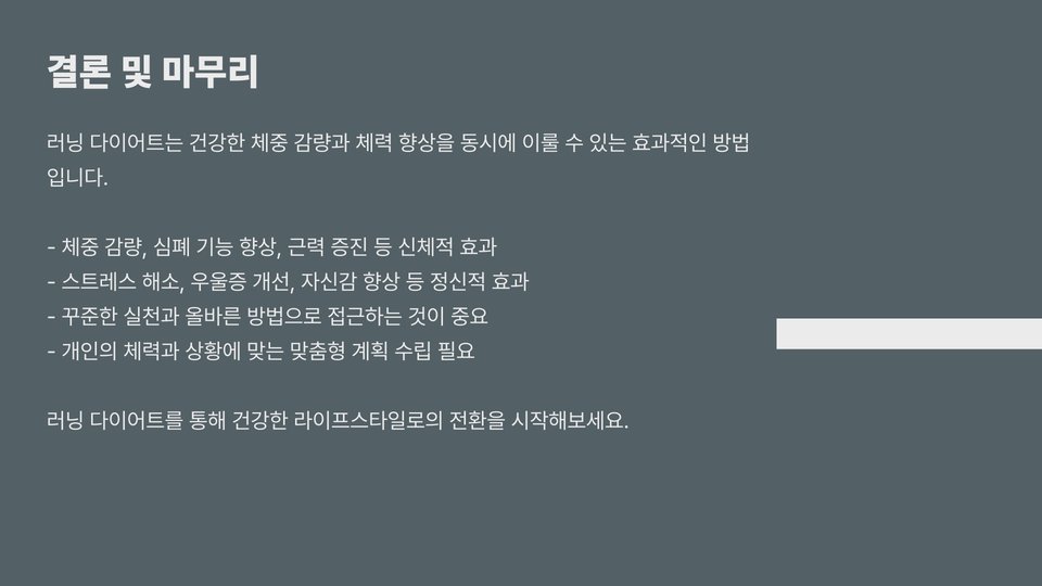 러닝 다이어트는 꾸준한 운동과 올바른 식습관을 통해 효과적으로 체중 감량을 도울 수 있는 방법입니다. 특히 러닝머신을 활용하면 다양한 환경에서도 쉽게 운동을 지속할 수 있습니다. 목표를 세우고, 운동 강도를 조절하며, 부상에 주의하는 것이 중요합니다. 러닝 다이어트를 통해 건강한 몸을 만들어보세요!