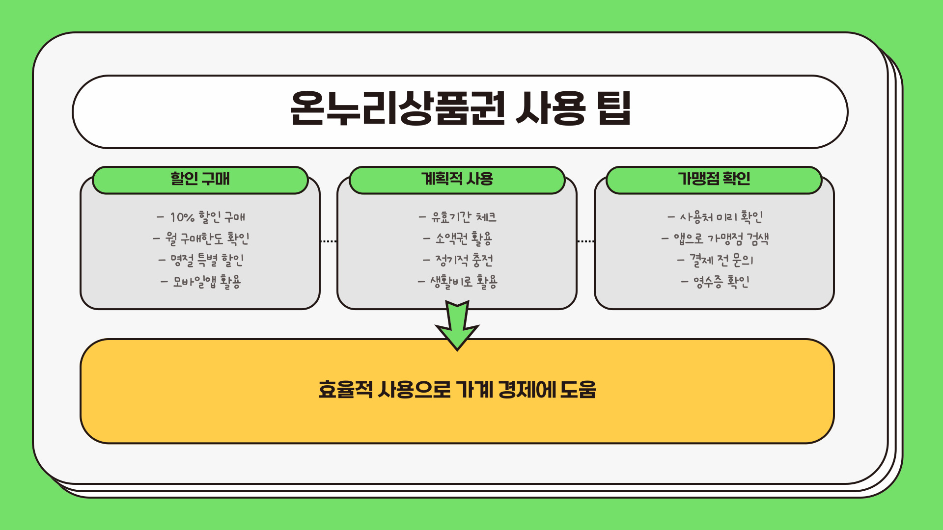 온누리상품권은 다양한 상점에서 사용 가능합니다. 주로 전통시장과 소상공인 가맹점에서 사용할 수 있으며, 일부 대형마트나 온라인 쇼핑몰에서도 사용 가능합니다. 사용처를 미리 확인하고 가는 것이 좋습니다. 특히, 전통시장에서의 사용은 지역 경제를 살리는 데 큰 도움이 됩니다. 예를 들어, 특정 시장에서는 상품권을 사용하면 추가 할인 혜택을 제공하기도 합니다.