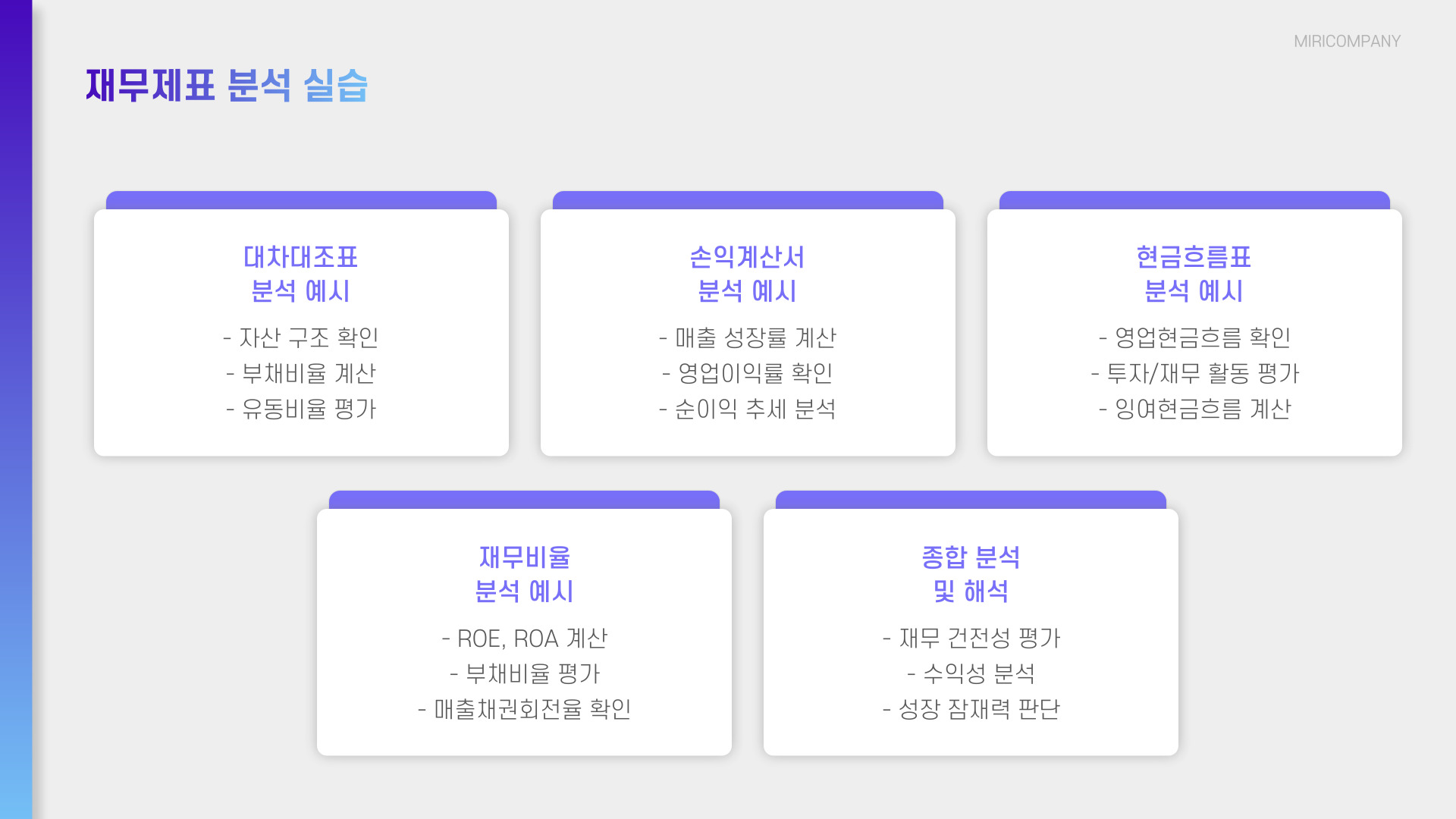 - 비율 분석: 다양한 재무 비율을 비교하여 기업의 재무 건전성을 평가합니다.