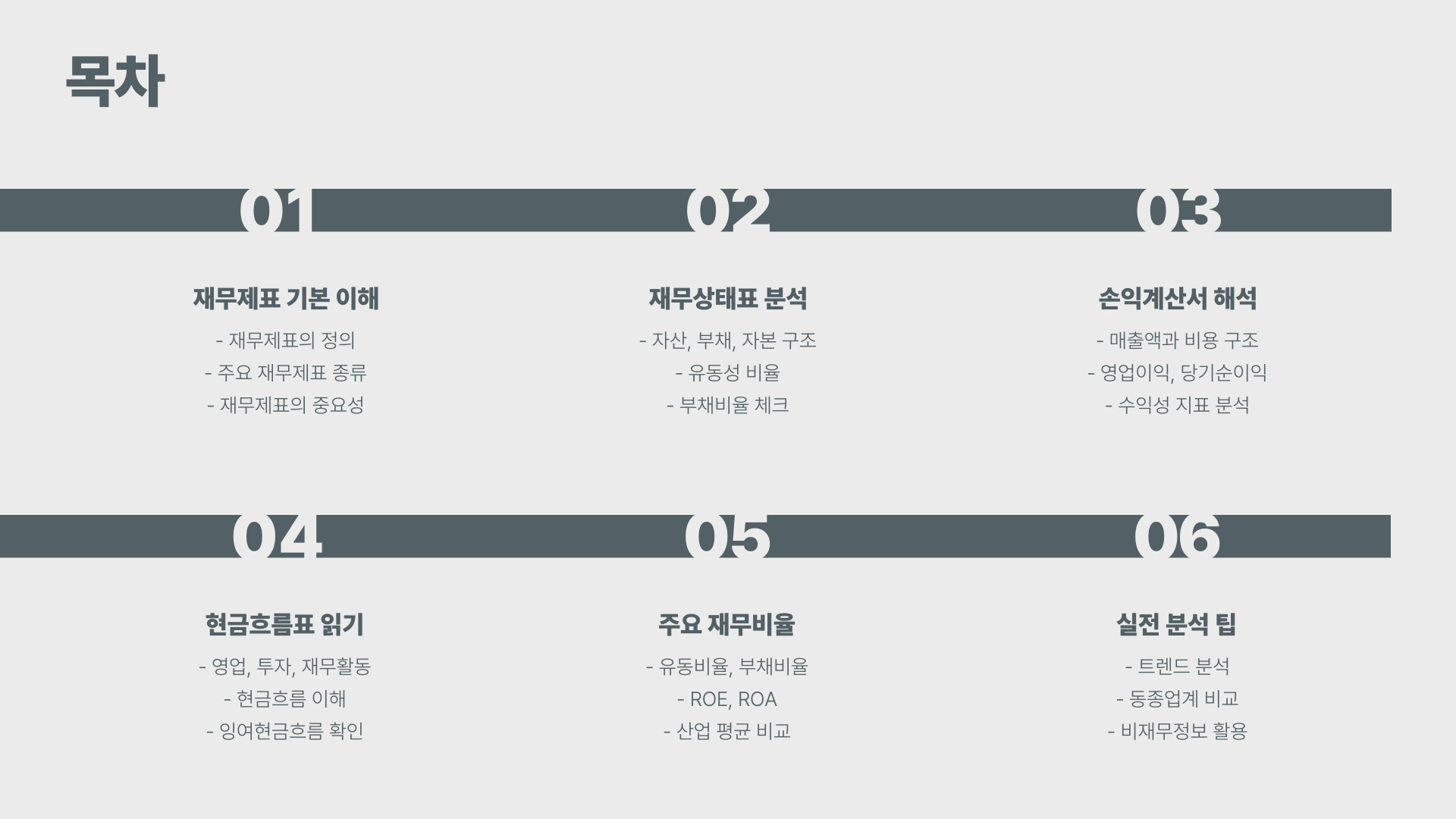 각 표의 이해는 재무제표 분석의 첫걸음이므로, 기본적인 구조를 확실히 파악하는 것이 중요합니다.