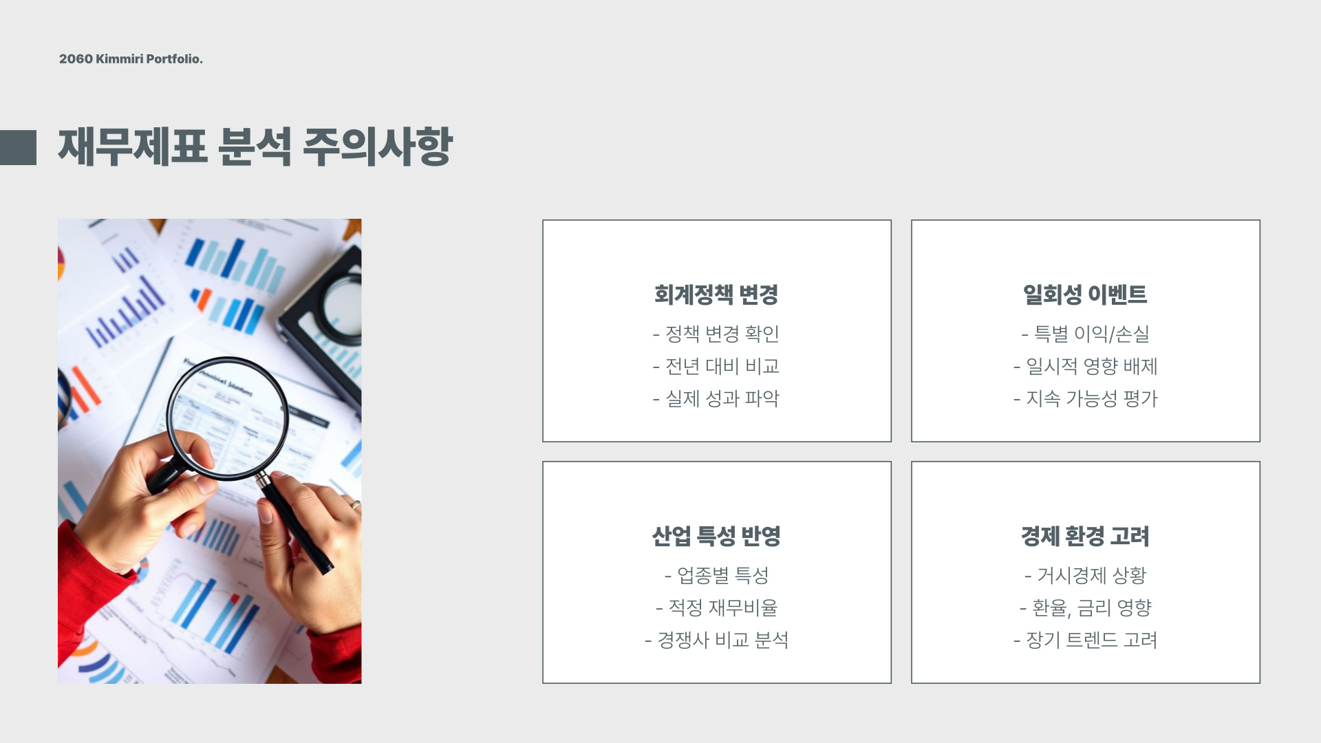 • 손익계산서: 매출과 비용 분석 및 순이익 평가